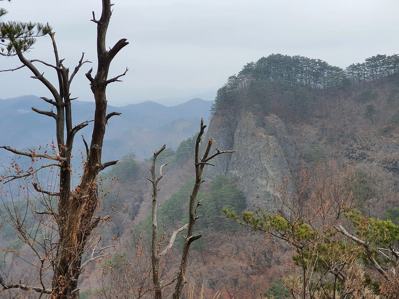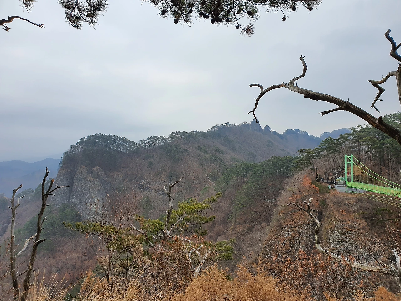 다시 하늘다리로 돌아와서 산을 올라가면서 등 뒤로 넘겨두었던 산의 풍광을 잠시 감상하기로 했다. 왔던 길을 돌아갈 때의 묘미는 또 이렇게 맛볼 수 있다. 갈 때 보던 모습과 뒤돌아 올 때의 모습은 다르다. 같은 길로 돌아가다가도 산에서는 길을 잃을 수 있는 이유가 거기에 있다.