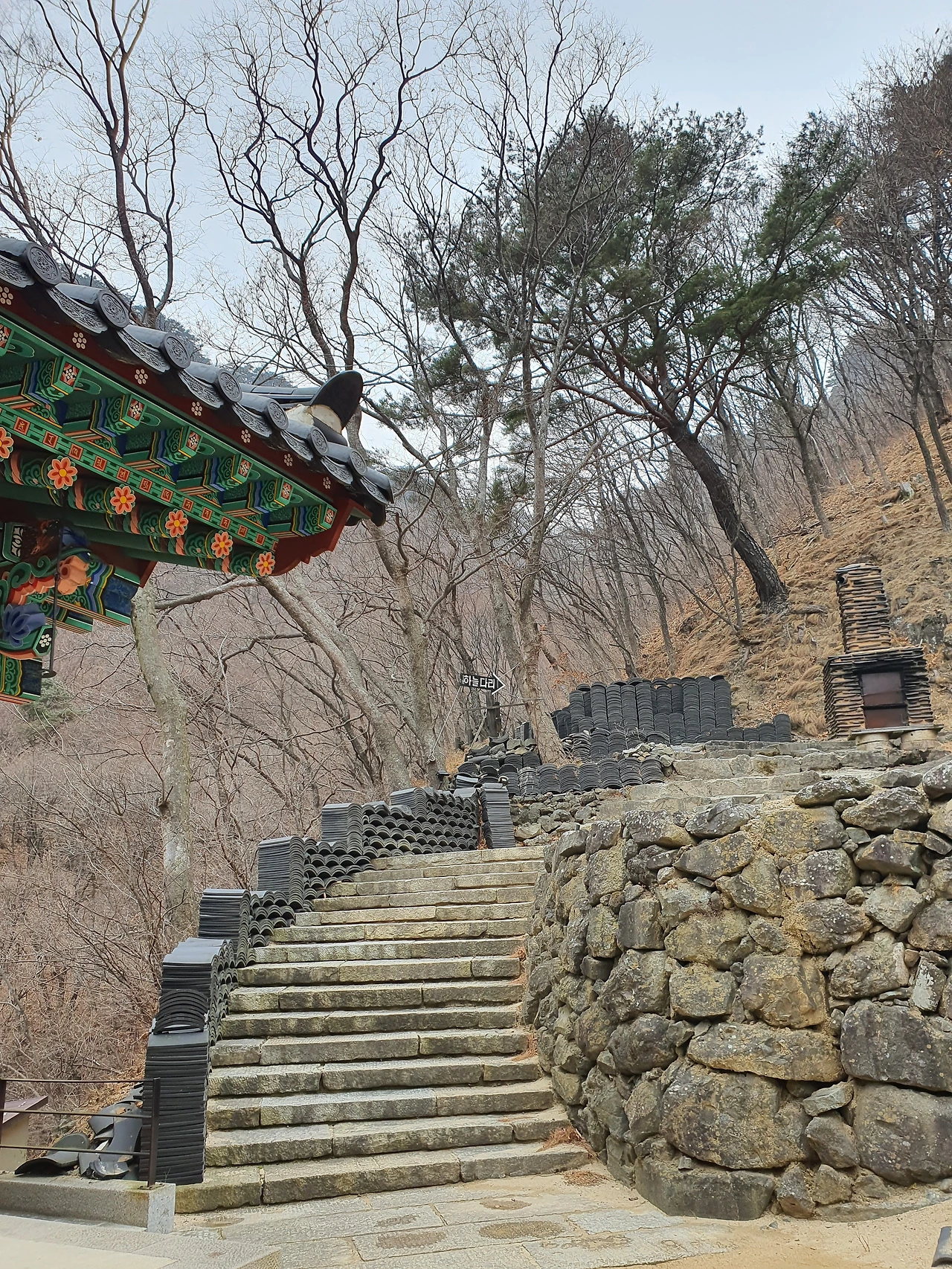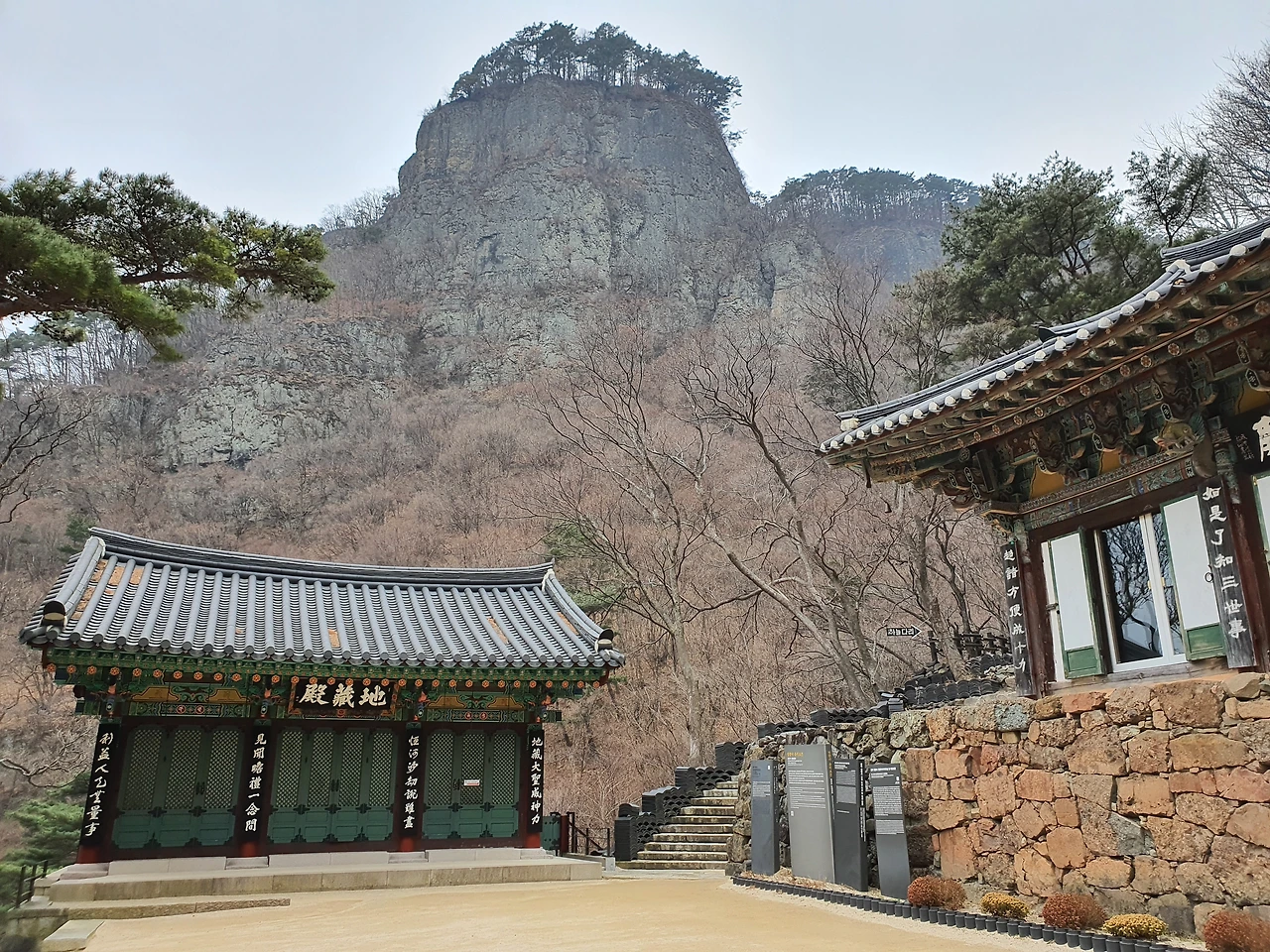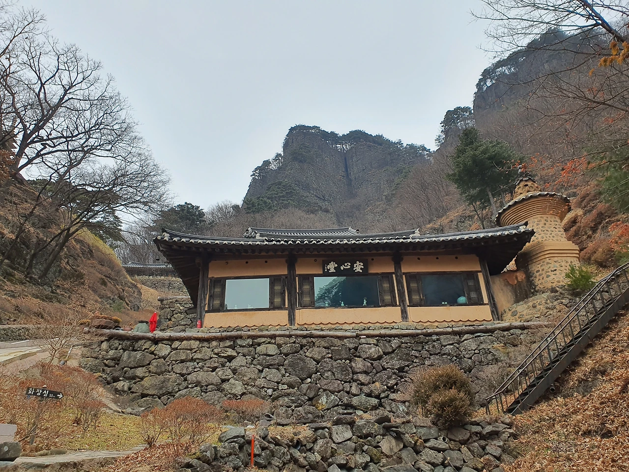 절 앞에 있는 석탑은 실제로 높이가 엄청 높다. 볕이 잘 드는 곳이라 봄가을로 사람들이 많이 모여 쉬어가곤 했다. 지금은 찬 바람이 스치고 있어 휑하다. 하지만 산과 마주하고 있는 모습은 그 위용이 압도적이다.