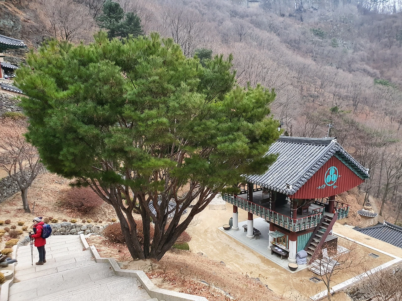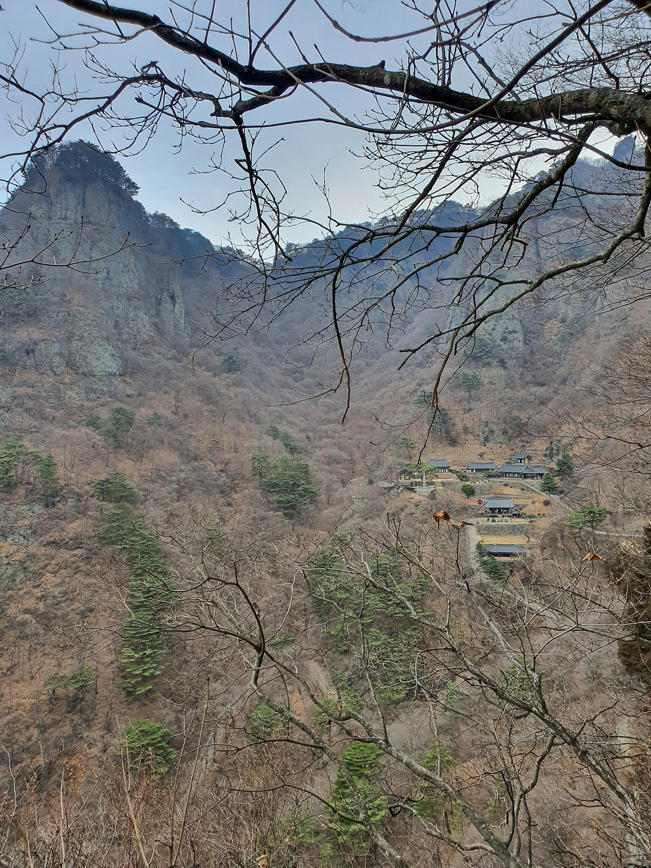 언뜻 보면 산의 일부 같아서 절이 있는 건지 잘 모르고 지나칠 수도 있을 정도로 산과 일체감이 느껴졌다. 추석에 왔을 때는 나뭇잎이 무성하게 숲을 이루고 있어서 절의 모습을 자세히 볼 수는 없었다. 산 능선을 중심으로 코스를 잡고 등산을 했기 때문에 청량사를 들를 기회가 없었다. 잎이 모두 지고 앙상한 가지 사이로 산의 윤곽선이 모두 드러난 지금 시야가 확보되어 산에 대해 더 많은 것들을 볼 수 있게 되었다. 산은 계절마다 와 보아야 할 이유가 여기에 있는 듯하다.