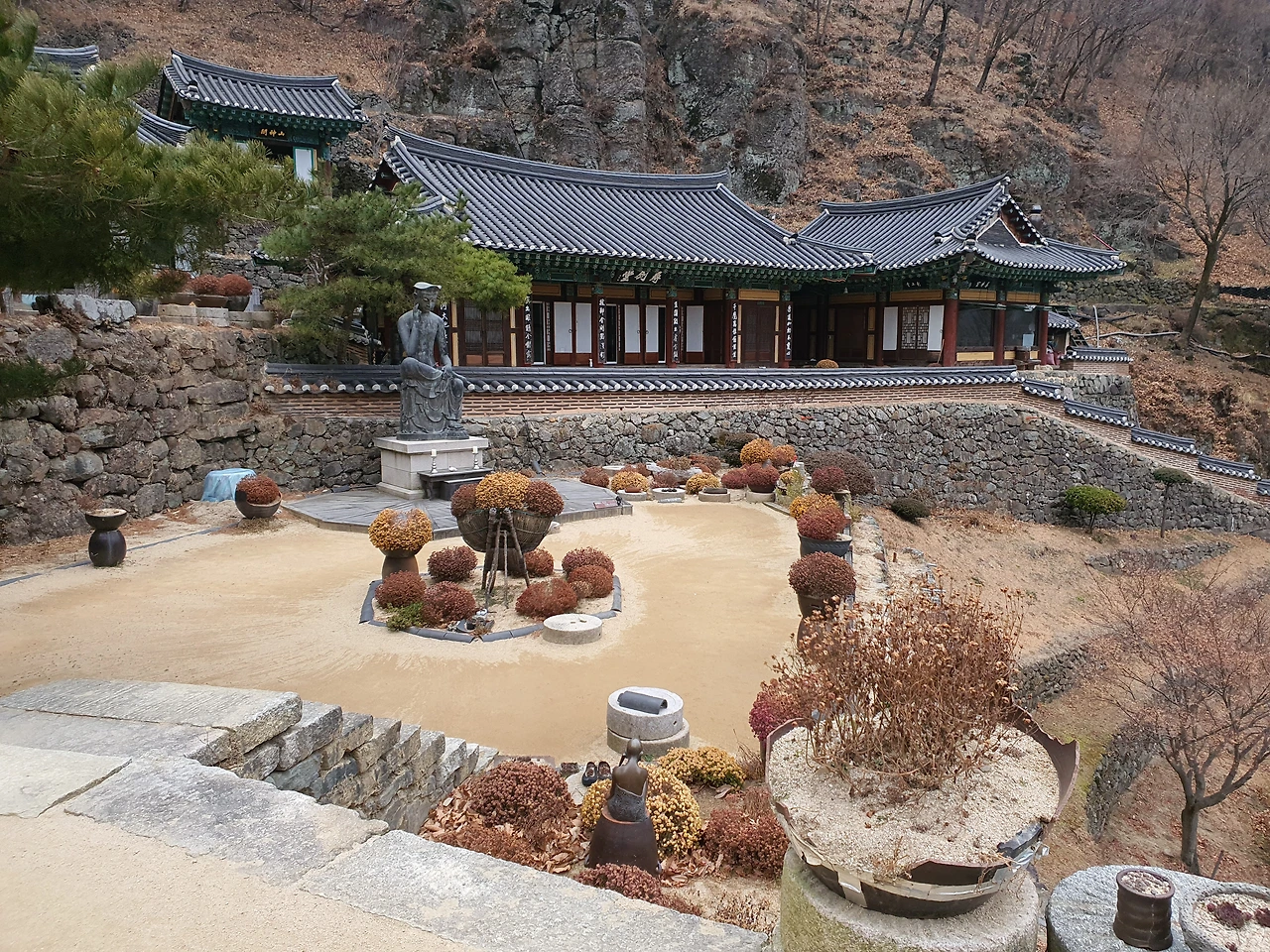 오랜 역사를 품고 있는 절이 생각보다 아기자기한 분위기를 풍기는 이유가 정원수 때문이 아닐까 싶었다. 위엄 있고 단아한 건축물과는 다르게 작고 아담한 정원수들과 곳곳에 놓인 화분에 다유기들이 웃음을 머금게 했다.