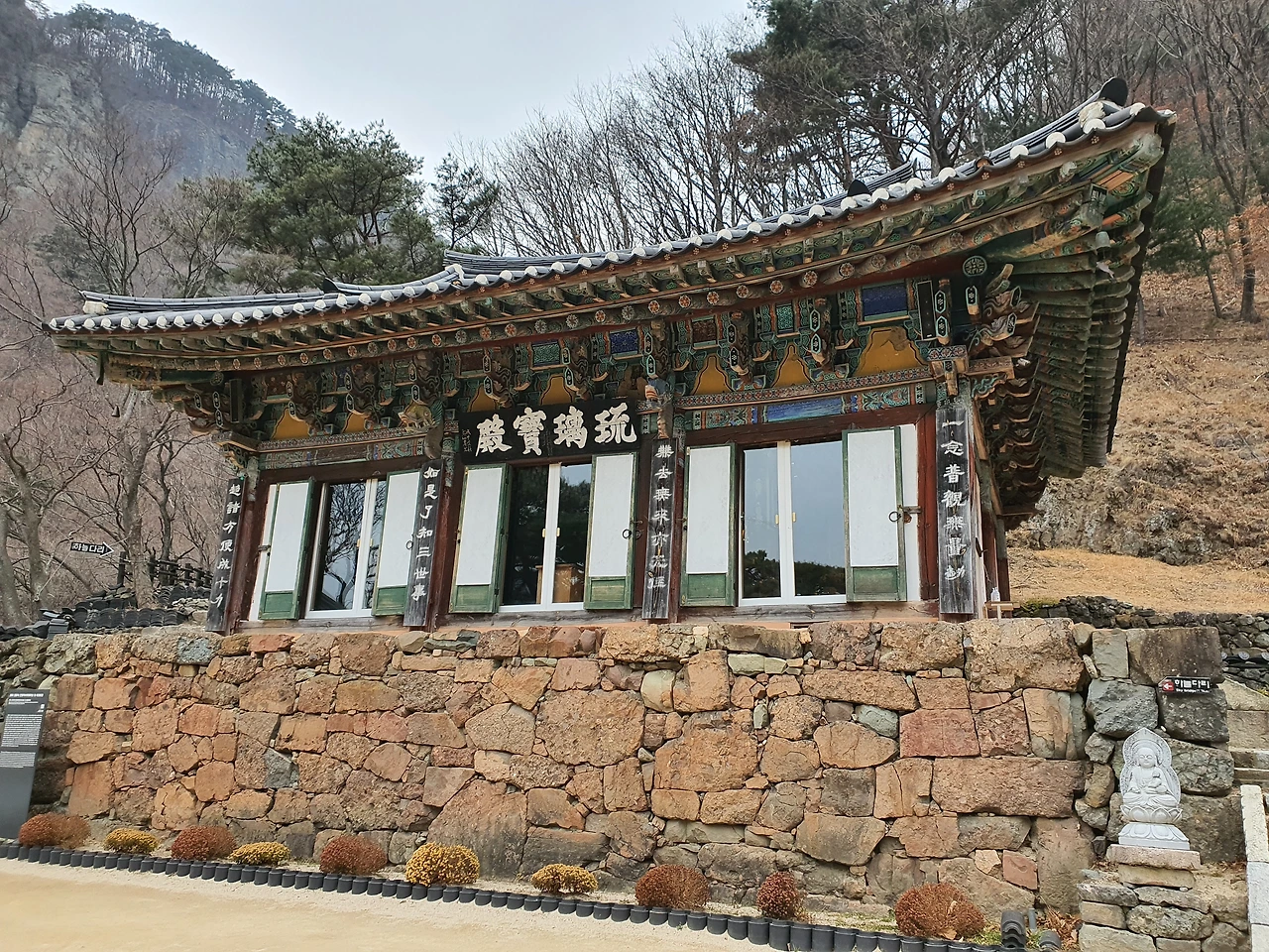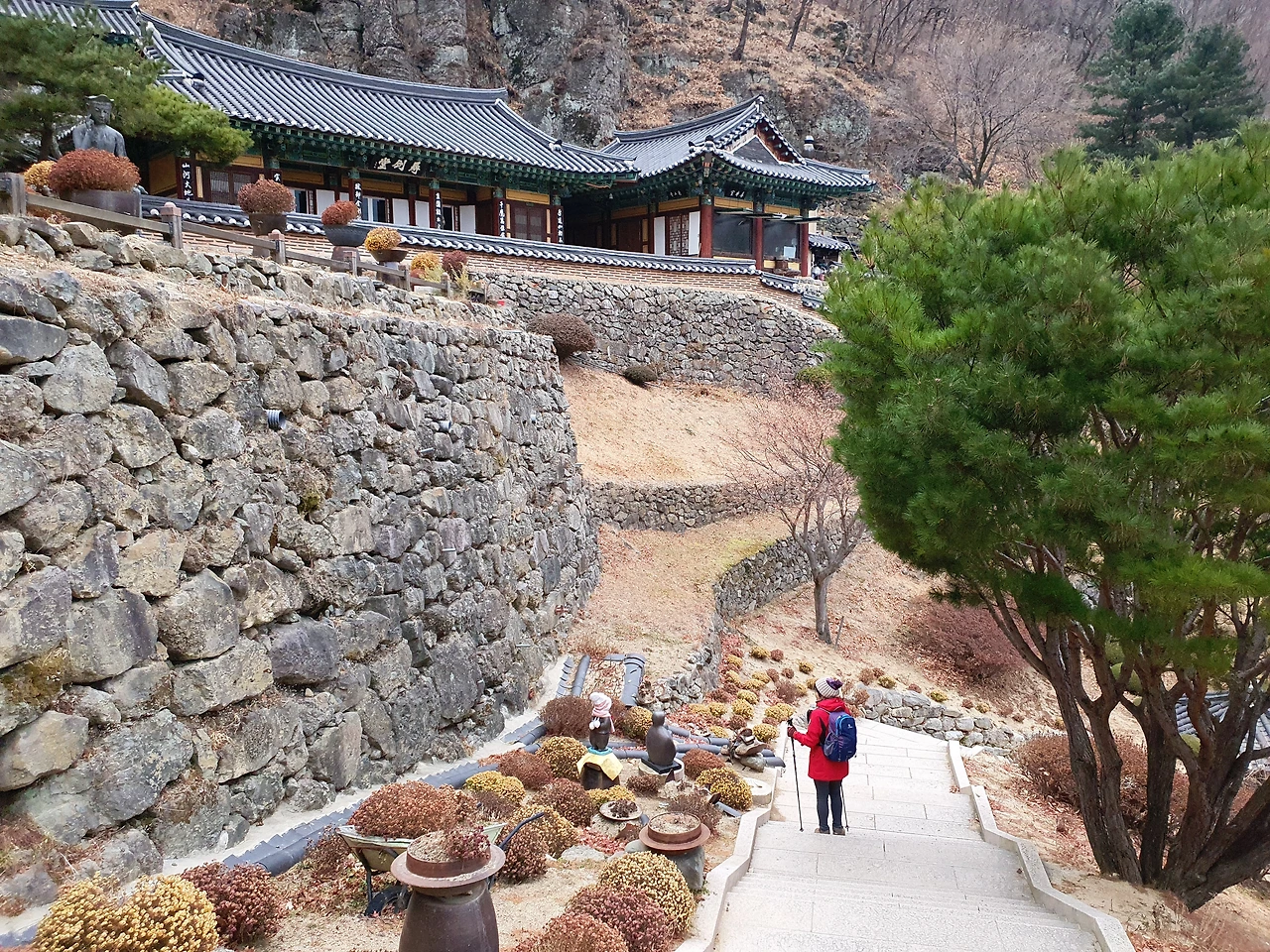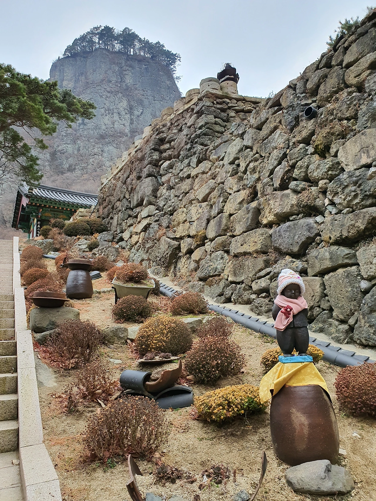 이 사진은 지극히 개인적인 느낌으로 찍었다. 위와 아래로 잘라서 분위기를 구분할 수 있을 정도로 색다른 장면이라 한 컷에 담아 보았다. 뒷짐을 지고 있는 동자에게 목도리와 모자를 씌워 놓은 이의 마음이 느껴져서 마치 온기가 흐르는 것 같았다. 한참을 바라보며 머물렀다가 내려왔다.
