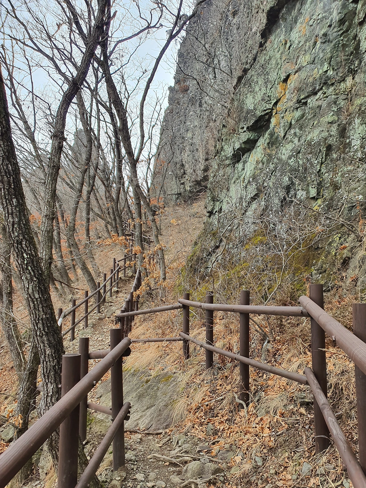 자소봉을 내려와 하늘다리로 향하는 길이다. 이 길의 반대편은 경일봉으로 가는 길이 잘 만들어져 있는데 동절기 사고 방지를 위해서인지 등산로 탐방 금지라는 플래카드가 크게 가로놓여 있다. 경일봉을 찍고 자소봉으로 올 계획이 틀어진 이유가 탐방 금지 문구 때문이었다. 자소봉을 뒤로하고 가면서도 아쉬웠다. 추석에 경일봉을 가면서 좋았던 기억이 떠오르니 더 미련이 남았다. 하지만 안전 산행을 위해 다음으로 미루기로 했다.