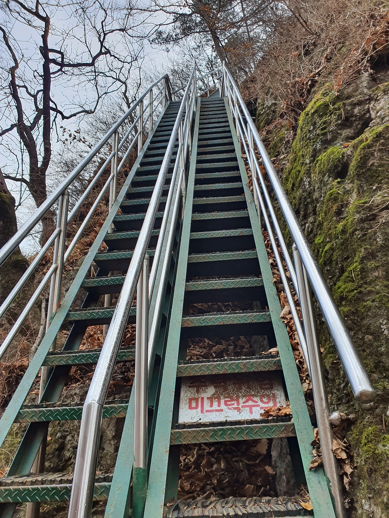 계단의 폭도 좁고 경사가 높아 내려오면서도 다리가 떨릴 지경이었다. 스틱을 사용하기에도 비좁은 폭의 계단이라 스텐 손잡이를 꽉 잡으며 내려왔다. 워낙 오래된 길인 듯하다. 철판 위에 올려놓은 고무마저도 닳고 달아 쿠션감이 조금도 없다. 다 내려오고 나서야 안도감이 들었다.