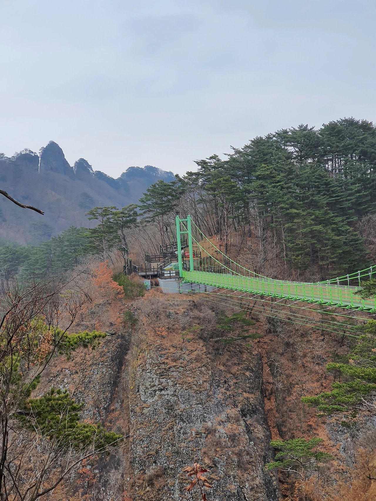 하늘다리 주변 산봉우리가 장관이다. 하늘다리가 없었다면 아주 깊은 골짜기를 내려갔다가 올라가야만 저 산을 밟아볼 수 있었을 것이다. 옛길이 아득하게 보이기는 하는데 탐방 금지 현판으로 오래전부터 막혀있는 상태였다. 몸이 가볍고 날렵한 사람만이 오르고 내릴 수 있을 것처럼 보이는 위태로운 길이었다. 짚신 신고 광목으로 만든 옷을 입던 사람들이 망태기를 들고 그 길을 오르지 않았을까 하는 상상을 해 본다.