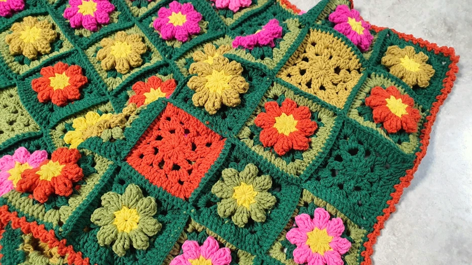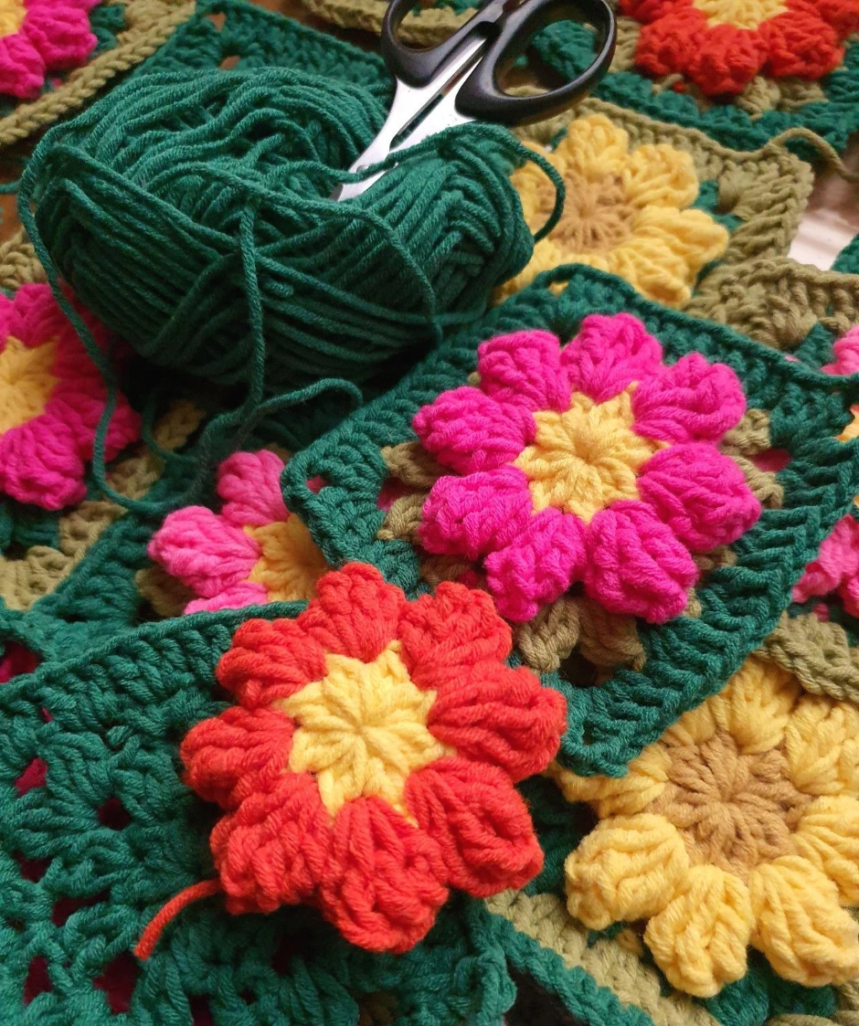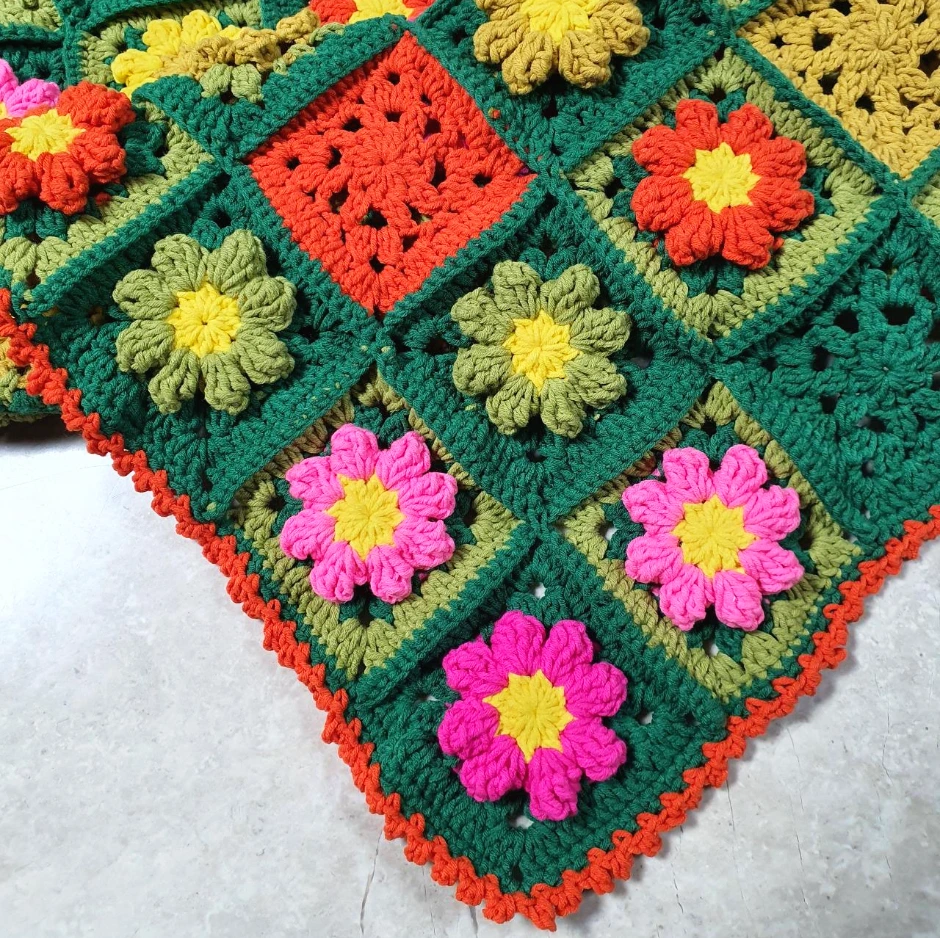 모티브 하나하나는 사랑스럽다. "세번 긴뜨기에 물방울"을 뜨면 꽃의 중앙을 만든다. 다섯 번 이중 긴뜨기에 첫코와 다섯 번째 코를 연결하면 꽃잎 한장이 만들어진다. 보기보다는 작업량이 많다. 들인 공에 비해 완성도가 부족하다고 느껴지는 이유 중 하나다.