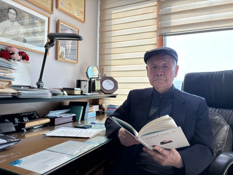 책상 위에는 그가 최근 자비로 출간한 책 '충렬탑에 이르는 길'이 놓여 있었다.