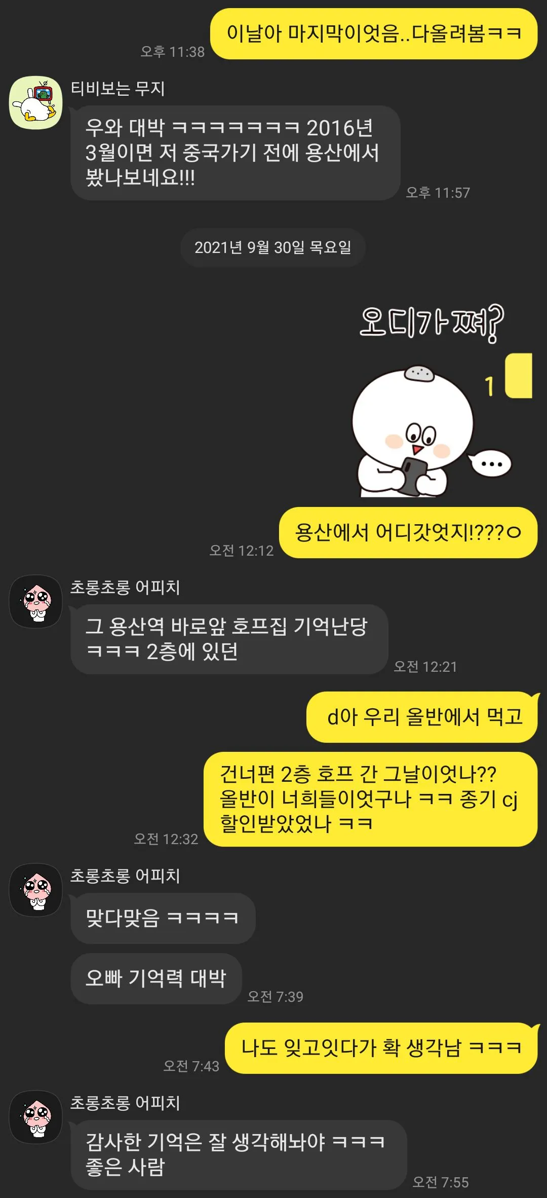 다음 주 모임을 앞두고, '우리가 예전에 언제 만났지?'라는 이야기를 주고받다가 카톡을 하나도 지우지 않은 습관 덕에 계속 위에까지 올리고 또 올렸다. 어렴풋이 기억이 나는 수많은 텍스트 흔적들, 유효기간이 만료되어 볼 수 없는 사진들, 그 속에서도 과거의 우리는 웃고 떠들었다. 그리고 나서야 우리가 마지막으로 본 게 2016년 3월임을 알게 됐다.