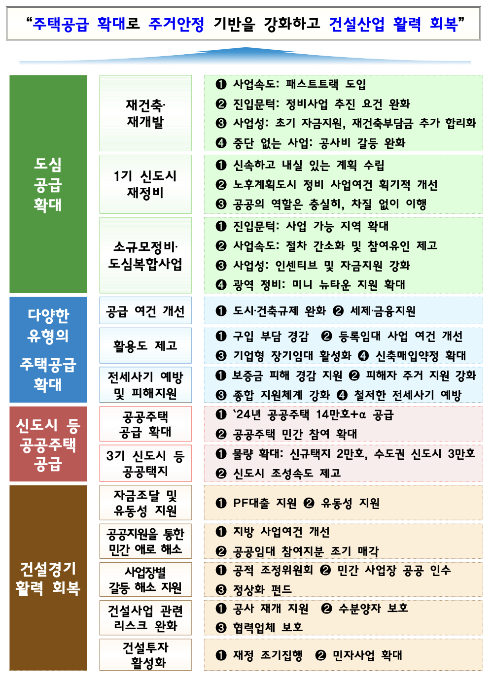 핵심은 '주택 공급'을 할 수 있게 엄청난 규제, 자금, 세제 지원등을 통해 '건설 산업 회복'을 하려는것 같습니다.