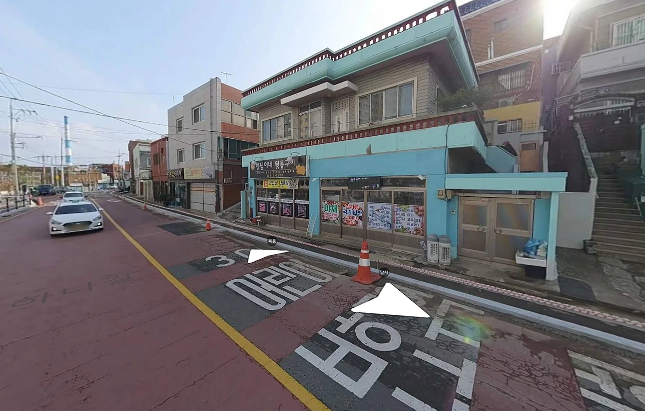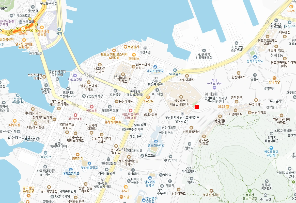 영도대교와 부산대교를 건너와 봉래산과 중간에 위치 함. 영도센트럴 에일린의뜰아파트 바로 인접하며, 8m터이상 2차선 도로를 점하고 있어 호스텔업도 가능할것으로 보입니다. 바로 앞 아파트 공개공지의 공원이며 버스정류장이 있습니다.