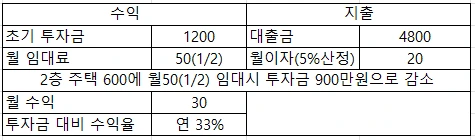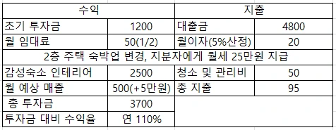 위 물건으로 단순하게 임대료만 받는것과 2층에서 숙박업을 했을때 등으로 표를 만들어 보았습니다.