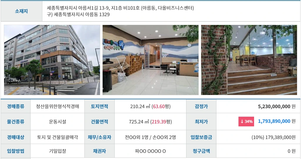 세종시에 너무 많은 상가분양으로 공실도 많고 유령도시 갔다고 하지만 저 지역은 '중심상업지'로 스타벅스과 입점해 있으며 수영장이라서 유찰이 되었지만 단순하게 현재 형성된 가격을 보면 충분히 감정평가 금액수준 혹은 45억이상 매각 할 수 있습니다. 제가 이곳을 낙찰받으면 현재 임차인 영업기간을 보장해줄것 같아 딱히 어떠한 사업을 하겠다와는 맞지 않지만 위 한방병원와 마찬가지로 현재 수영장하시는분이 낙찰 받는다면 이 글의 취지 처럼 월세가 반정도로 줄어들며, 영업기간 상관없이 계속 사업을 할 수 있기에 이 글을 씁니다.