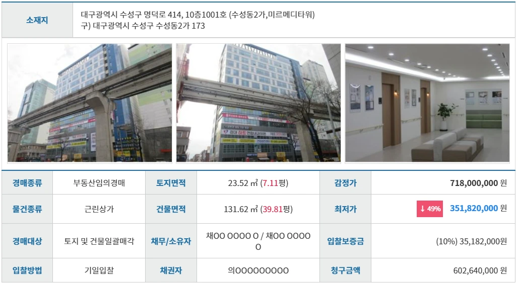 본건은 대구광역시 수성구 수성동2가 소재 "수성시장역" 남서측 인근에 위치하며, 부근 일대는 각종 근린생활시설 및 오피스텔 등으로 형성되어 있습니다. 본건까지 차량의 출입이 가능하며, 인근에 시내버스승강장 및 도시철도3호선이 소재하는 등 제반 교통사정은 양호합니다. 가) 철근콘크리트구조 평지붕 13층건중 제10층 제1001호로서외벽: 복합판넬 마감,내벽: 페인트 및 내부 인테리어 마감,바닥: 타일 마감,창호: 새시창 마감 등입니다.