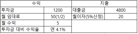 지분 1/2이기에 월세 50만원이 들어와도 25만원의 임대료를 받고 월이자 20만원을 내면 귀엽게 매달 5만원이 수익으로 잡히고 투자금 대비 연 4.1%로 나쁘지(?)않지만 ㅎㅎ 현재 점유하고 있는 2층에 대한걸 넣어놓지 않았습니다. 2층도 보증금 600만원에 월세 50만원은 받을 수 있을것 같아 그렇게 산정하면 아래와 같습니다.