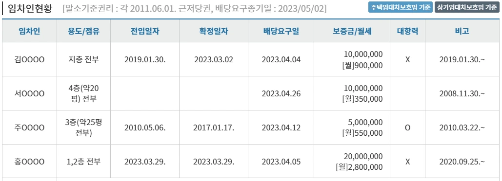 위 물건을 현 최저가인 1.2억(계산편의상)에 낙찰 받는다고하면 2,400만원이 투자금이 되고 9,600만원을 담보대출 받습니다. 연5% 이자로 환산시 월 이자는 40만원으로 현재 월차임에서 제외하면 50만원의 매달 임대료 수익이 생깁니다. 본 건은 대항력이 없음으로 2,000만원 보증금은 사라지게 되어 낙찰을 받게 된다면 임차인에게 다시 보증금 2,000만원을 요구 할 수 잇습니다. (실제 투자금은 400만원인 샘) 그나마 다행인건 23년 5월 임차인에게 경매 송달이되어 현재까지 월세를 납부 안했다고 가장하고 앞으로 낙찰된다고해도 올해 11월 까지 임대료 납부를 안했다고하면 약 19~20개월 미납으로 재산상의 큰 피해는 없을 것으로 판단 됩니다.