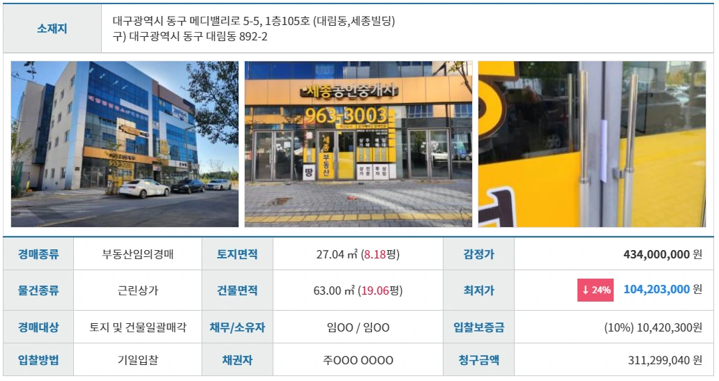 1년 반정도 된 한방 병원으로 계속 영업을 영위 할것으로 보이며, 이곳 역시 임차인이 1년전 경매 고지를 받아 재산상의 손해는 없을것으로 보입니다. 소액투자로 임대수익을 올리며 임차인이 나간후 학원, 병원, 사무실등으로 사용 가능합니다. *현 한방병원 임차인분이 낙찰 받으면 월세를 1/3 수준으로 줄이고 ~N년후 충분히 감정가격 이상으로 매각 가능 할 것으로 보입니다.