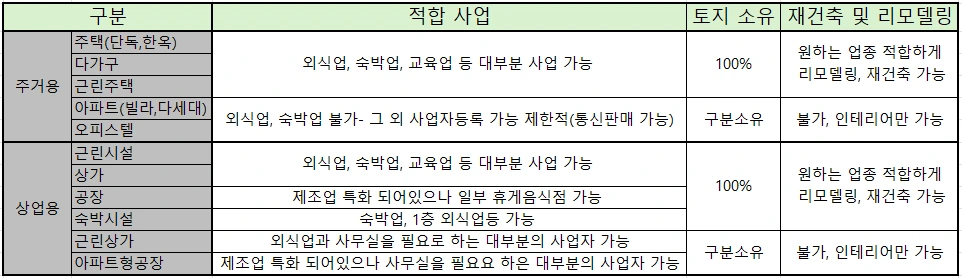 대한민국에서는 부동산 = 아파트 로만 통용이 되는 경우가 많습니다. 우선 사업을 하기 위한 내공간을 매입하기 위해 부동산을 구분해보았습니다.