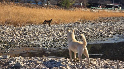 진돗개 두마리와 자갈밭을 돌아다니며 돌을 줍는다.