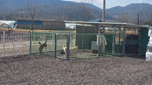 두 마리 모두 진돗개인데, 하얀색 몽실이가 엄마, 호랑이무늬 호호가 딸이다.