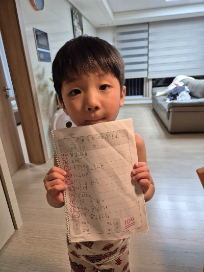 며칠 후 저녁, 받아쓰기 시험지를 꺼내드는 둘째의 목소리에 웃음이 베어있다.