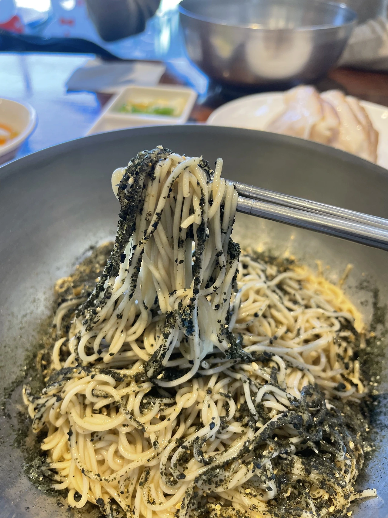 면이 절반쯤 남았을 때 육수를 부으면, 들기름 향이 육수 위를 떠다니며 입안에서 완전히 새로운 질감을 만들어낸다.