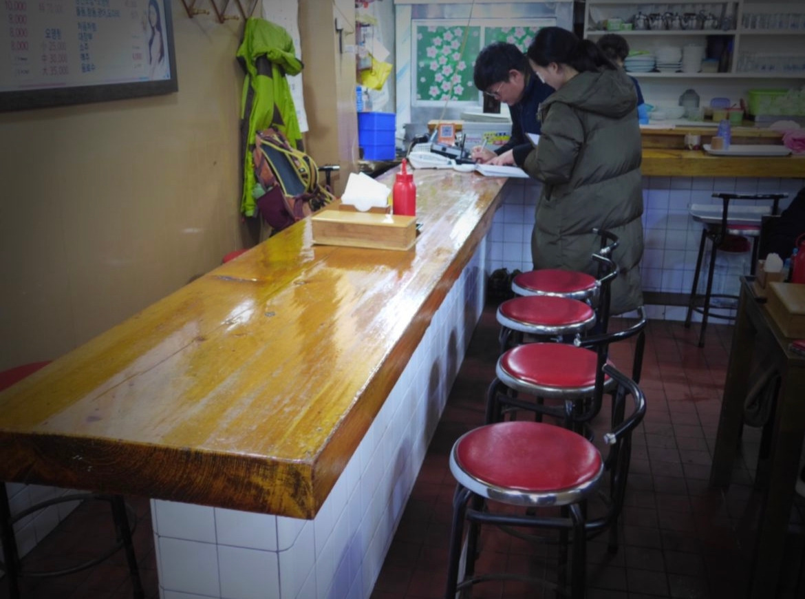 심지어 이 식당 한편엔 1980년대 일식집에서 유행했던 하얀 타일 기둥에 나무판을 얹은 다찌가 있어 <50년 노포>의 아우라가 넘쳐흐른다.