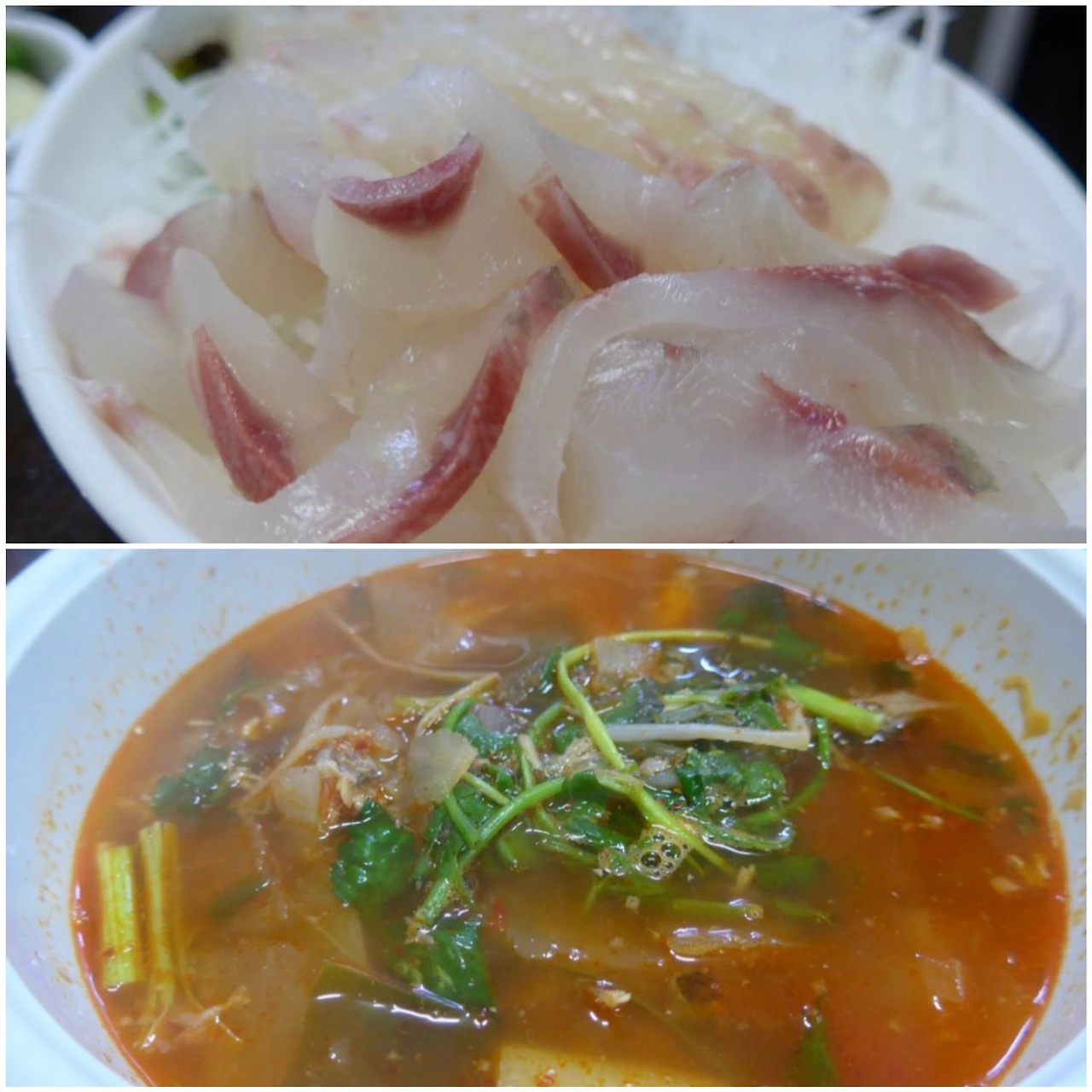 부산의 회백반은 대부분 다시마로 회를 숙성시켜 썰어주는 것으로 알고 있다. 이 역시 13천 원이라기엔 황송할 정도로 광어와 밀치회가 넉넉하게 접시에 담겨 나오고, 후추향이 강하긴 해도 계속 떠먹게 되는 매운탕이 함께 제공된다.