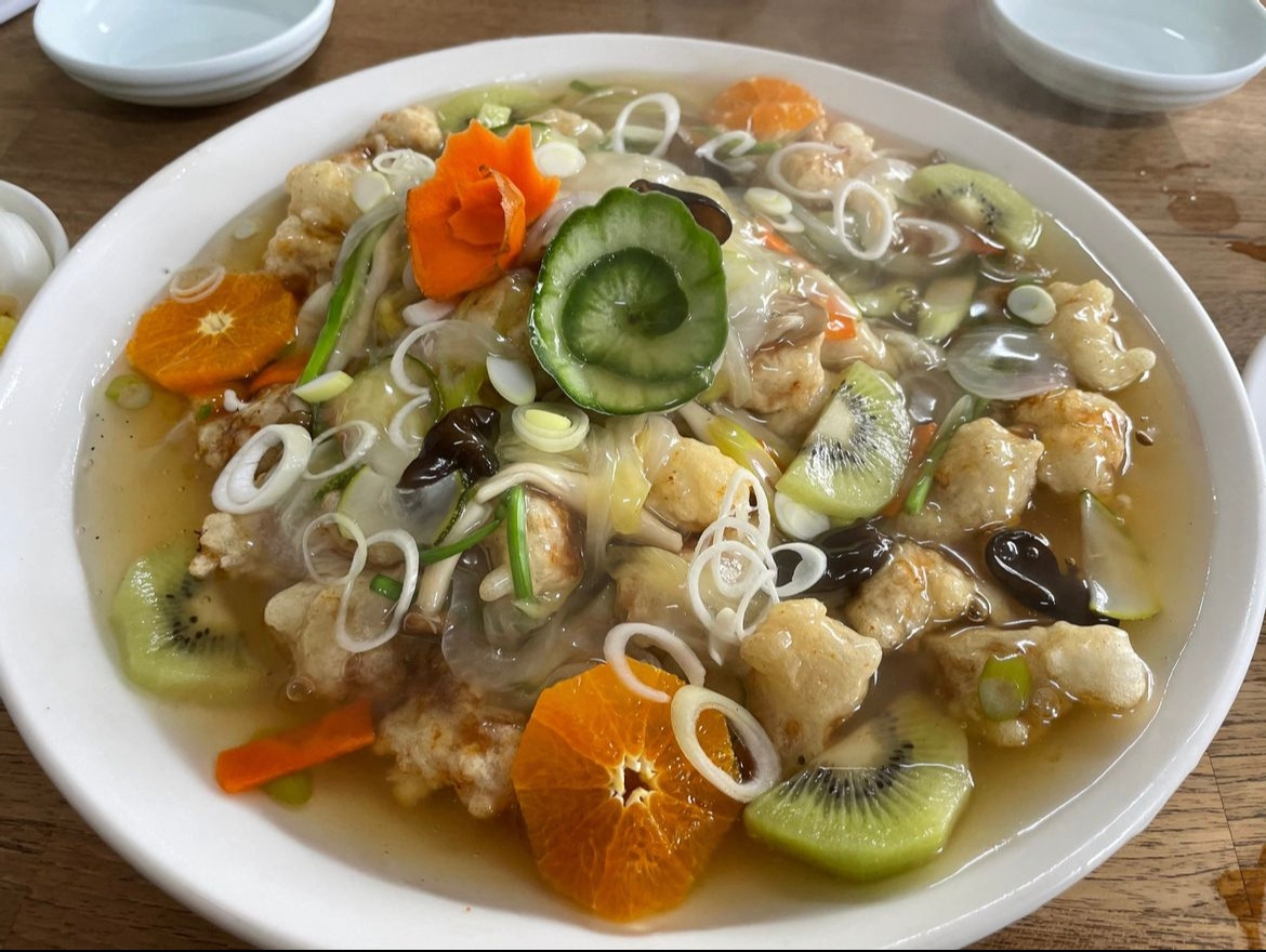 탕수육 역시 이 집만의 특징이 있다. 잡내 하나 없는 고기, 깨끗한 기름으로 제대로 튀겨낸 고기 튀김의 식감, 천연의 단맛을 내기 위한 키위와 귤, 꽃 모양으로 깎아낸 오이와 당근은 음식을 만드는 데 있어 노사장님 내외가 얼마나 큰 정성을 불어넣는지 보여주는 증거이다.