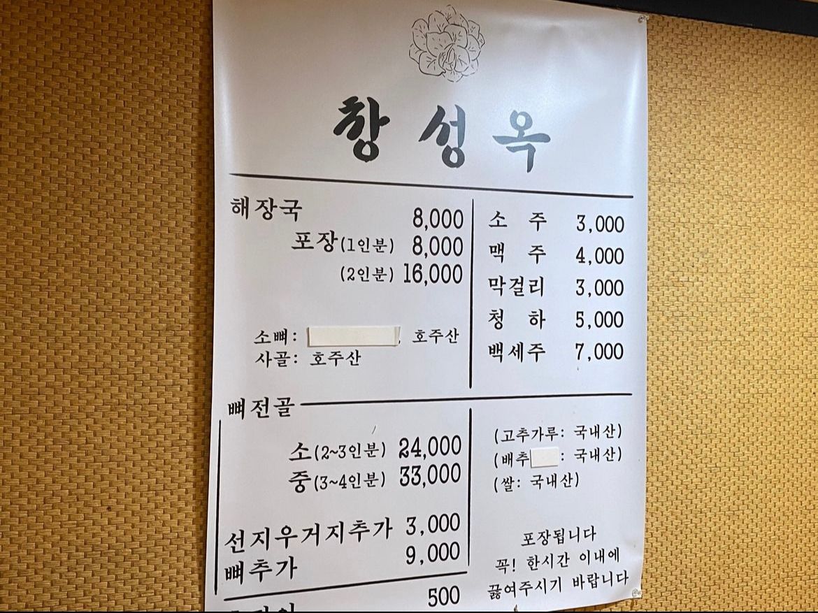 메뉴판을 보면 창성옥이라는 상호명 위에 <배추속대> 그림이 있는데, 실제 양념장을 섞지 않고 국물을 떠먹어보면 “된장 얼갈이국” 느낌이다. 창성옥의 상징물을 배추속대로 한 것은 주인장께서도 여타 서울식 해장국과 다른 아이덴티티를 그리 삼은 모양으로 추정한다.