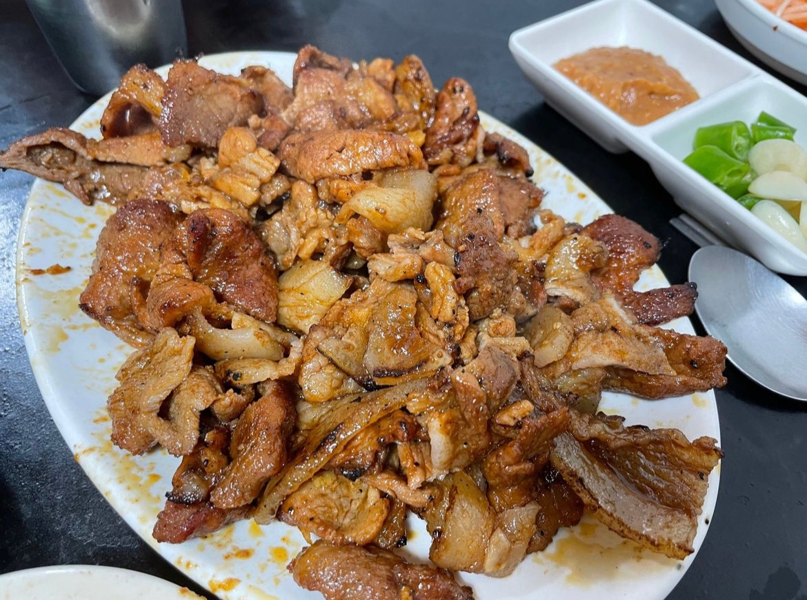 생선구이 식당들과 닭한마리 식당들의 중간 경계 지점에 <불꼬지 백반>이라는 신기한 이름의 고추장 양념 돼지고기를 연탄불로 파는 식당이 있으니 1988년 개업하여 30여 년을 훌쩍 넘긴 송정식당이다.