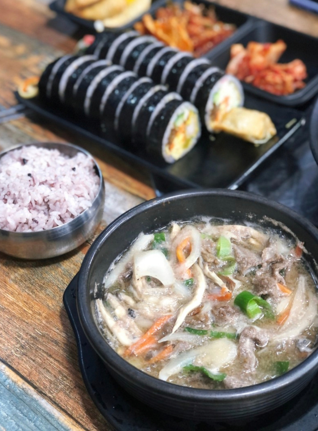 이 식당의 화룡점정은 불고기이다. 당연히 <옛날 불판>으로 달라하였는데, 간장을 베이스로 했으되 설탕의 사용은 최소화하였고, 육수는 사골과 양지로 우려낸 뽀얀 곰탕 국물이다. 곰탕 국물을 육수로 사용하는 불고기는 처음 경험해봤는데 처음에는 은은했던 맛이 간장 양념과 함께 졸아들며 맛이 조화로워진다.