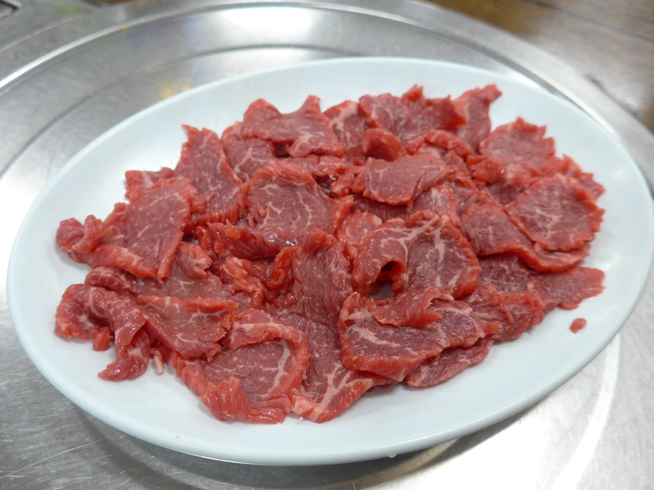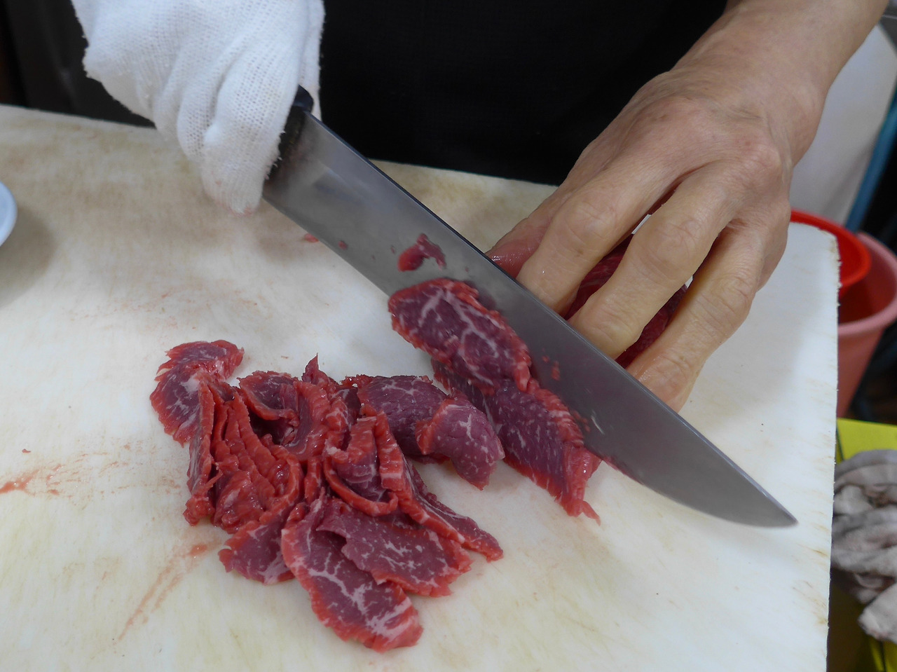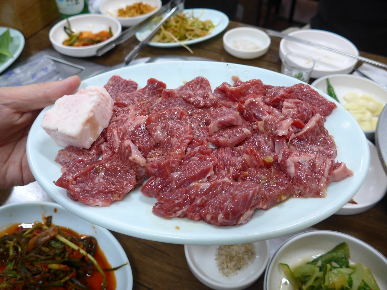 우선 이 집에서 주문한 것은 육사시미이다. 소 잡는 날이 따로 있는지 벽면에 '금일 육사시미 있음'이라는 안내판이 재미있다. 주문과 동시에 정육고에서 고기를 꺼내 바로 칼질을 해주시는데 고기가 신선해서 대구의 뭉티기살처럼 접시를 엎어도 고기가 떨어지지 않는다.