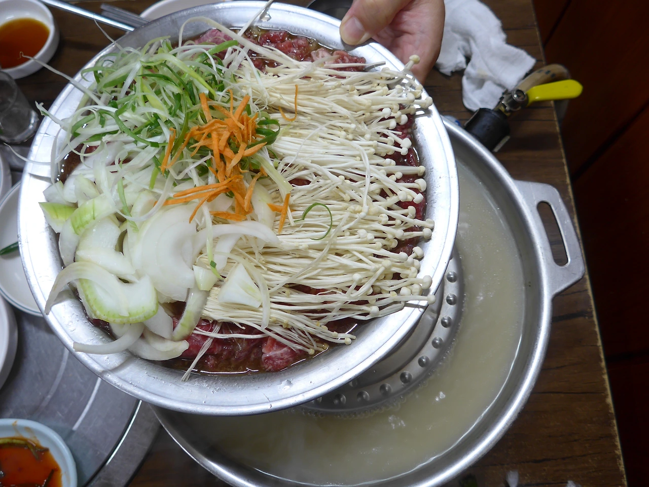 재미있는 부분은 뚝배기 불고기라는 메뉴의 등장으로 우리에게 익숙해져 버린 육수 불고기는 <서울식>이라 불리는데, 서울식 불고기라 통칭하는 조리 방식에도 오목한 판에 끓여내는 <전골> 방식과 고기를 구워내는 중앙 부분은 솟아있고, 가장자리에는 당면과 채소를 양념국물에 조릴 수 있는 <하이브리드> 방식 2가지로 구분된다는 것이다.