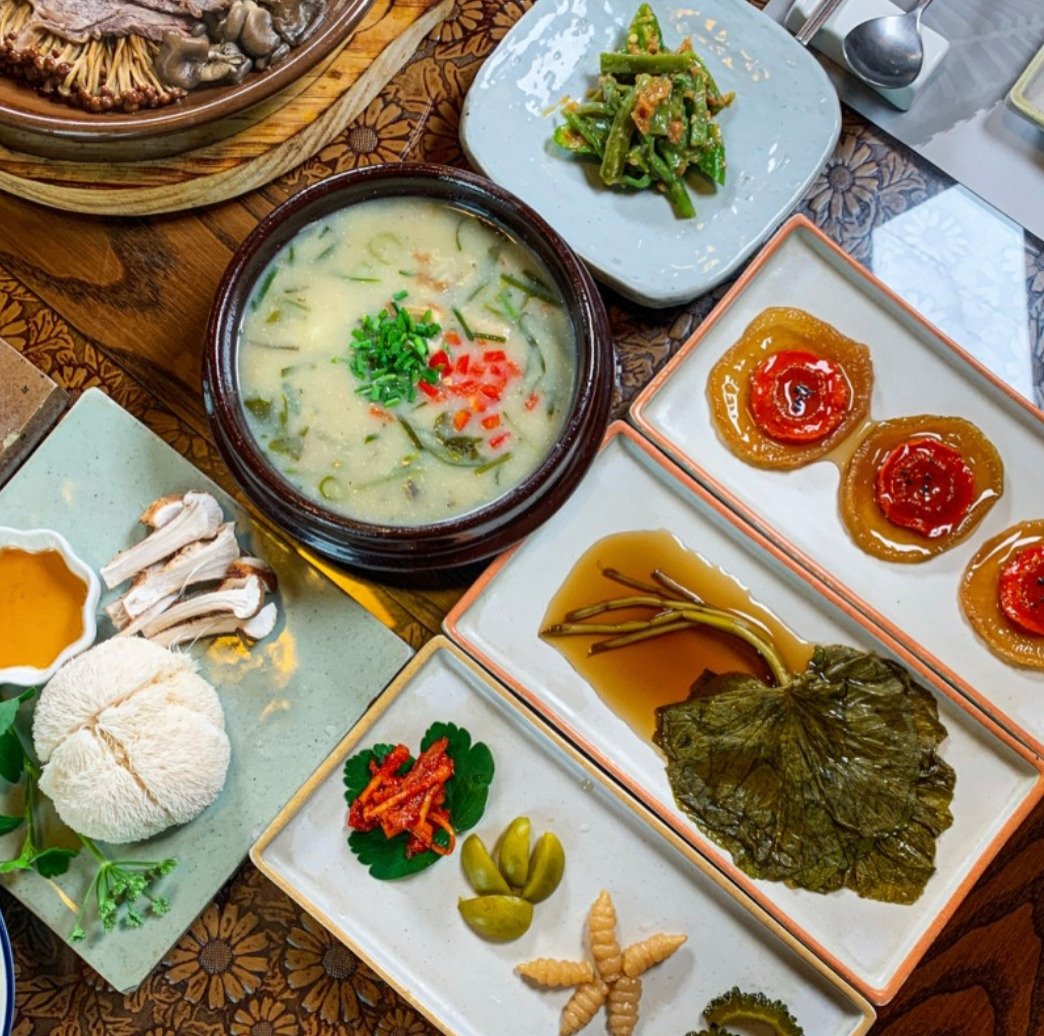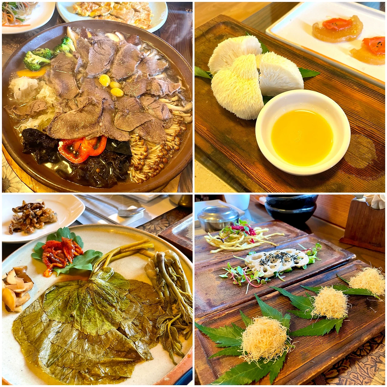 면역과 항암 기능에 좋은 버섯이 잔뜩 들어간 한우모둠버섯전골을 필두로 당뇨 예방에 효과적인 노루궁뎅이 버섯, 콜레스테롤 수치를 조절해 주고 혈관 질환을 물리치는 삼채 튀김, 원기 회복과 가래에 효과가 좋은 더덕 무침, 효소로 담근 곰취와 두릅 장아찌 등 평시 일반 한식당에선 만나기 힘든 귀한 반찬이 가득이다.