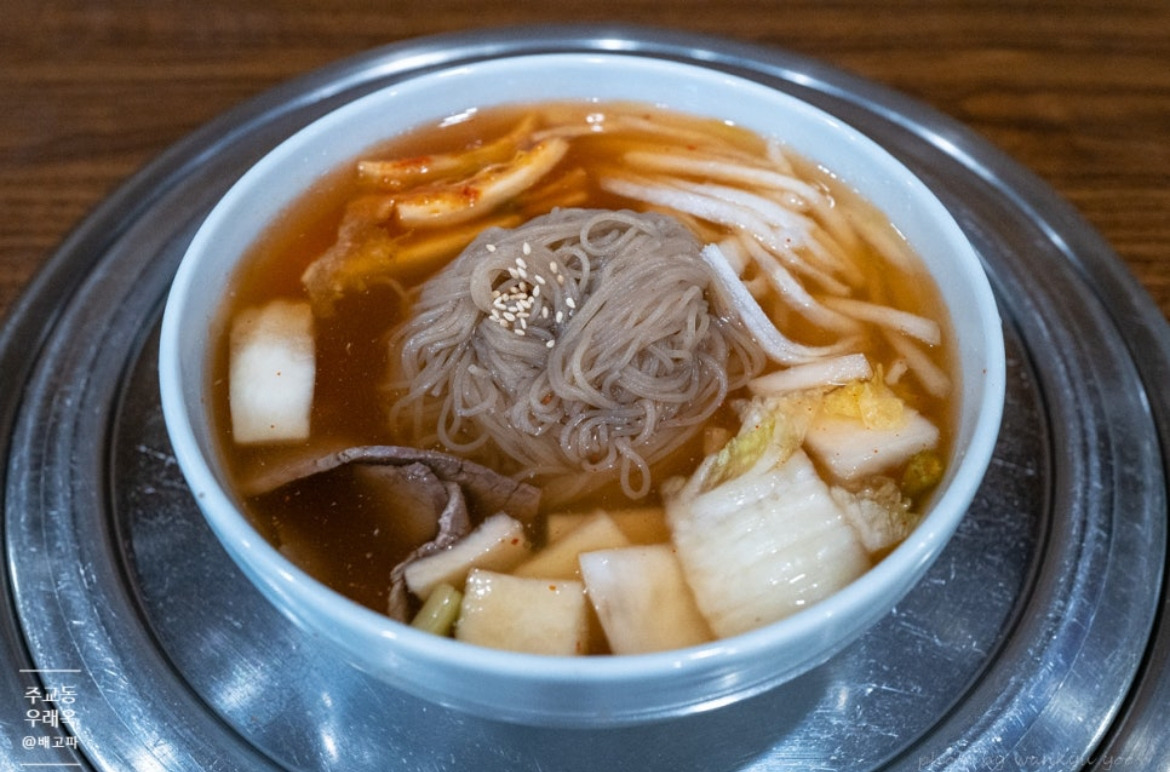 평양냉면은 양념과 조미료에 좌우되는 음식이 아니다 보니 맵거나 달 고, 시고, 짠맛이 일체 배제된 슴슴한 절제미가 강조되는 음식이다. 그러나 오히려 그 맛이 슴슴하기에 은은하게 치고 올라오는 메밀 향, 채 로 썰어 낸 배에서 올라오는 달큰함, 맑은 육수를 들이켜고 난 후 올라오는 육향 등이 하나하나 제대로 느껴진다. 「우래옥」은 오로지 한우로만 육수를 내기에 시중의 다른 평양냉면보다 육수의 향이 진하기로 유명하다. 맛이 좀 밋밋하다 하여 평양냉면을 멀리 하는 이들에겐 ‘평냉 입문 식당’으로 추천할 만하다.