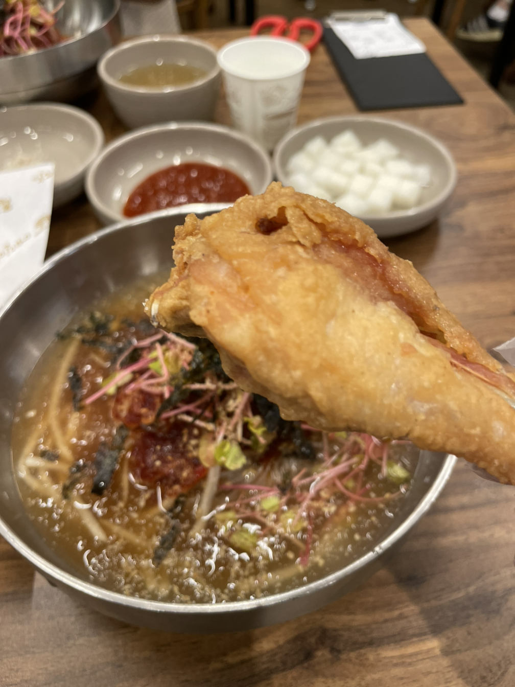 이븐(Even ; 고르게)하게 튀겨낸 치킨의 익힘 정도가 매우 좋았고, 차가운 막국수와 함께 먹을 뜨겁고도 바삭한 치킨의 튀김옷이 주인장의 의도가 무엇인지 알 수 있게 한다.