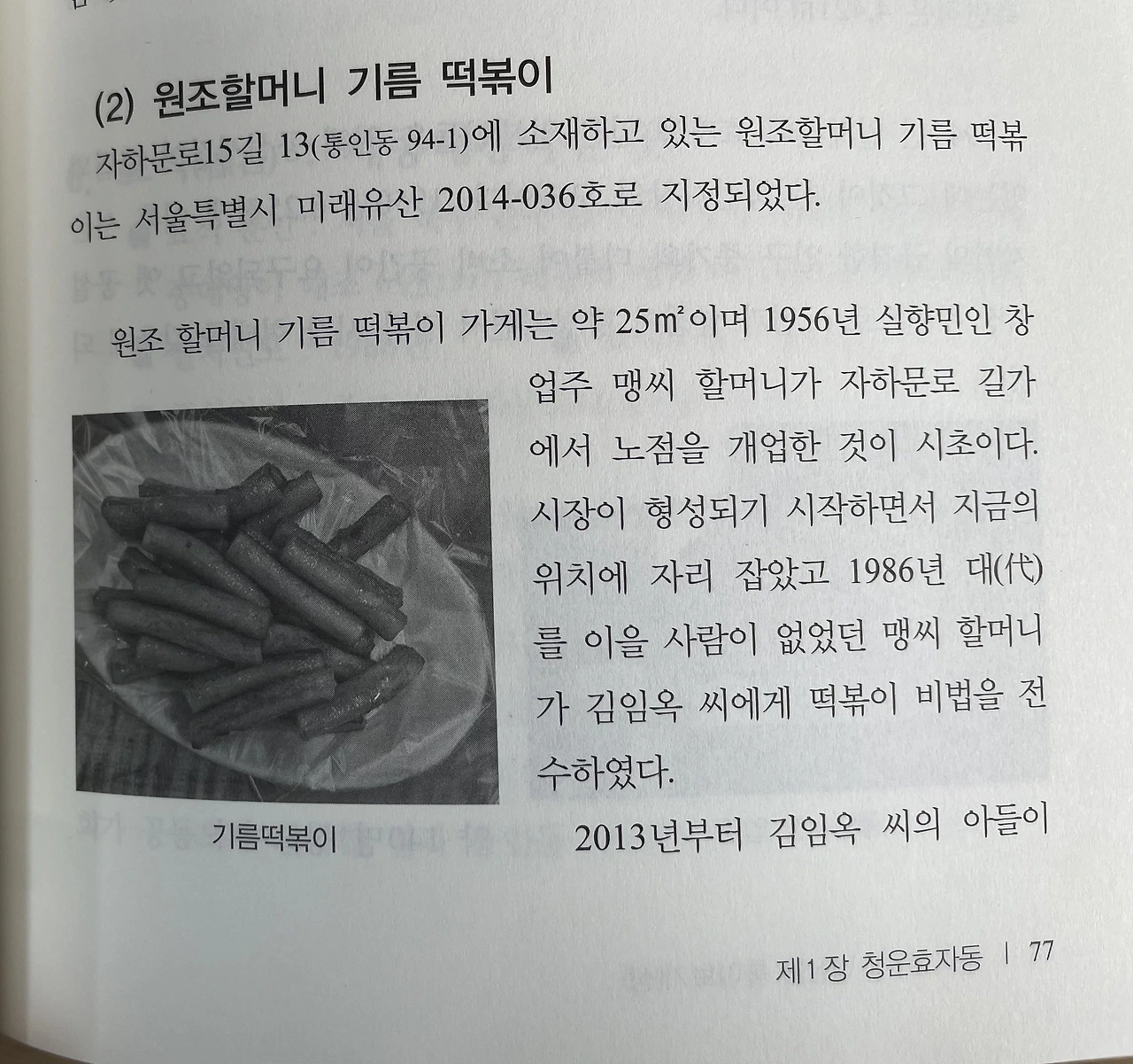 전쟁이 끝난 직후의 서울은 고향을 잃은 사람들로 넘쳤다. 그들은 저마다의 방식으로 낯선 땅에 뿌리를 내리려 했고, 맹씨 할머니는 번철 위의 떡으로 그 일을 해냈다. 종로문화원이 발행한 『종로 87개 법정동 톺아보기』는 이 집의 내력을 기록한 몇 안 되는 문헌 중 하나다. 자하문로 길가의 작은 노점이 수십 년을 지나 지금의 자리에 이르기까지, 그 기름떡볶이는 단순한 간식이 아니라 한 실향민이 서울에 남긴 생의 흔적이었다.