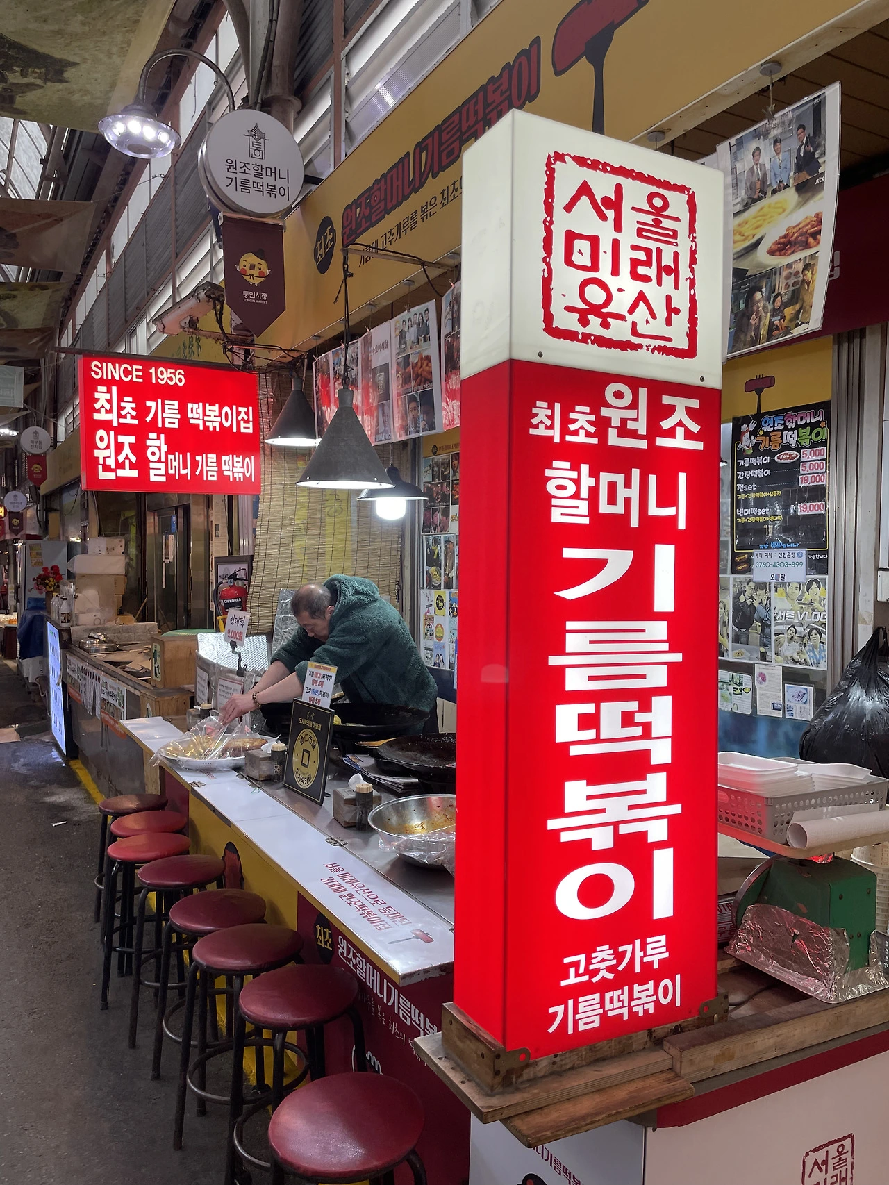 조선시대 법궁인 경복궁의 서쪽에 자리한 통인시장은, 1941년 일제강점기 공설시장으로 출발했다. 서촌이라 불리는 이 동네는 조선시대 역관이나 의관 같은 중인들이 모여 살던 곳이다. 권력의 중심에서 한 발짝 비껴선 사람들의 동네. 그 기질이 시장에도 흘러들었는지, 통인시장은 지금도 대형 유통자본에 점령당하지 않은 채 제 나름의 속도로 살아간다. 엽전을 사서 도시락을 꾸려 먹는 ‘엽전도시락’ 문화가 관광 명물이 되었고, 그 시장 골목 한편에 기름떡볶이 집들이 나란히 자리를 지키고 있다.