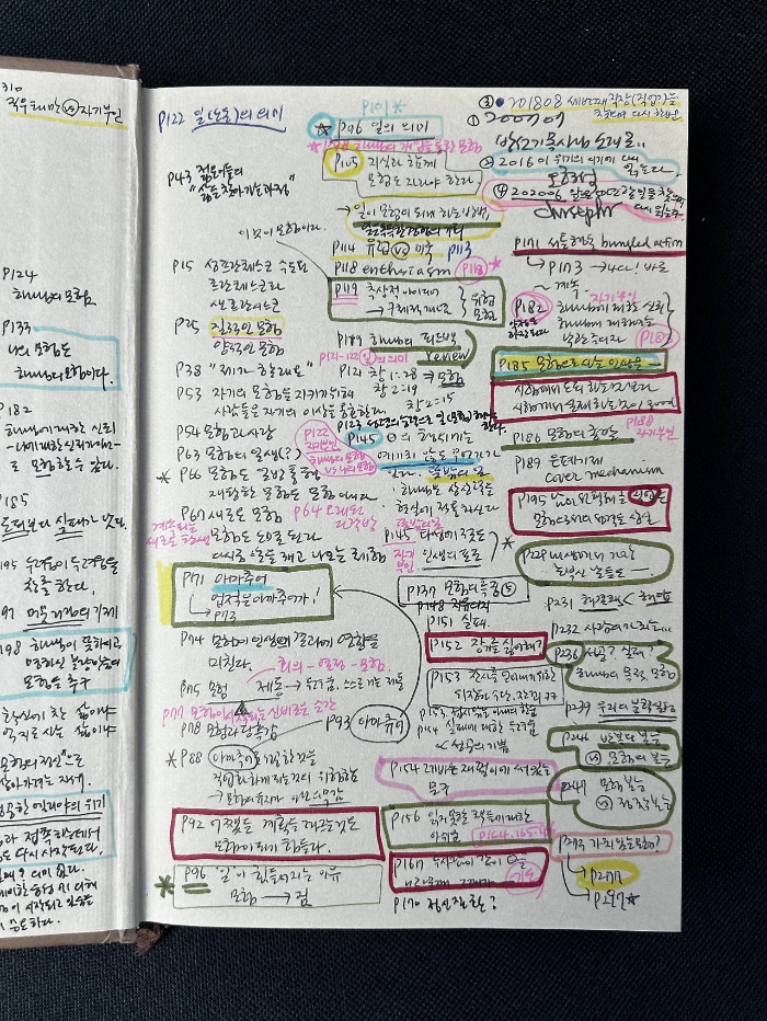나는 인생책은 다시 읽을 때마다 다른 컬러의 펜으로 메모를 하고 밑줄을 긋는다. 그렇게 하는 이유는 다시 읽기를 할 때마다 이전에 읽었을 때와 지금의 내가 어떤 차이를 보이고 있는지, 어떤 성장과 변화를 겪고 있는지를 확인할 수 있기 때문이다.