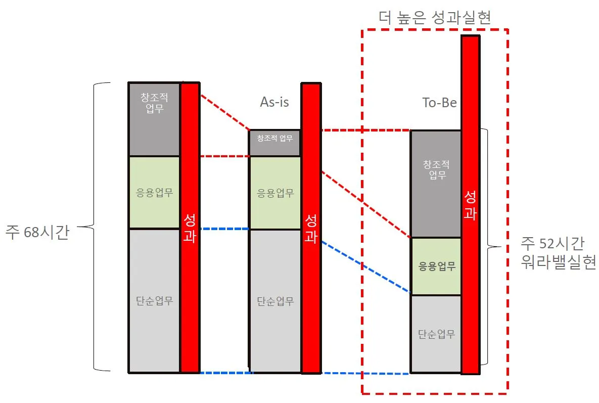 - 응용 업무와 단순 업무는 최소화시키거나 제거시키고, 창조업무를 확대할 수 있도록 노력한다.