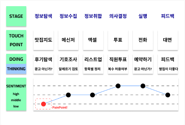 이러한 어려움을 찾기 위해선 유저의 여정지도를 그리며 실제 사용자가 겪는 어려움은 어떤게 있을지 검토하는 과정이 필요하다.