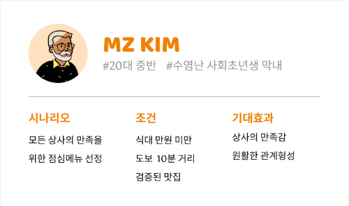 점심 메뉴를 찾아야하는 MZ 킴 씨를 예로들어 적합한 페르소나를 생성하기 위해선 몇가지 고려함이 필요하다