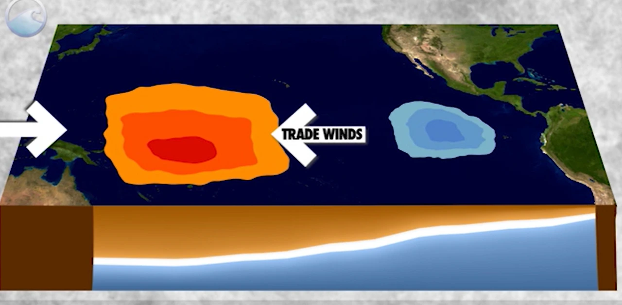 태평양은 지구 대양의 1/3일 차지하며 적도를 중심으로 동쪽에 위치한 미국 북서부에서 서쪽에 위치한 아시아 쪽으로 달궈진 해수면 온도를 무역풍을 불어 보낸다. 이에 미국의 북서부는 차가운 해수면을 유지하면서 풍부한 어획량을 가져온다.(라니냐) 2~7년 주기로 무역풍이 약해져 뜨거운 해수면 온도가 미국 북서부와 캐나다 쪽을 달궈 고온 건조한 날씨를 만들고 남쪽으로는 홍수를 야기한다. (엘리뇨)