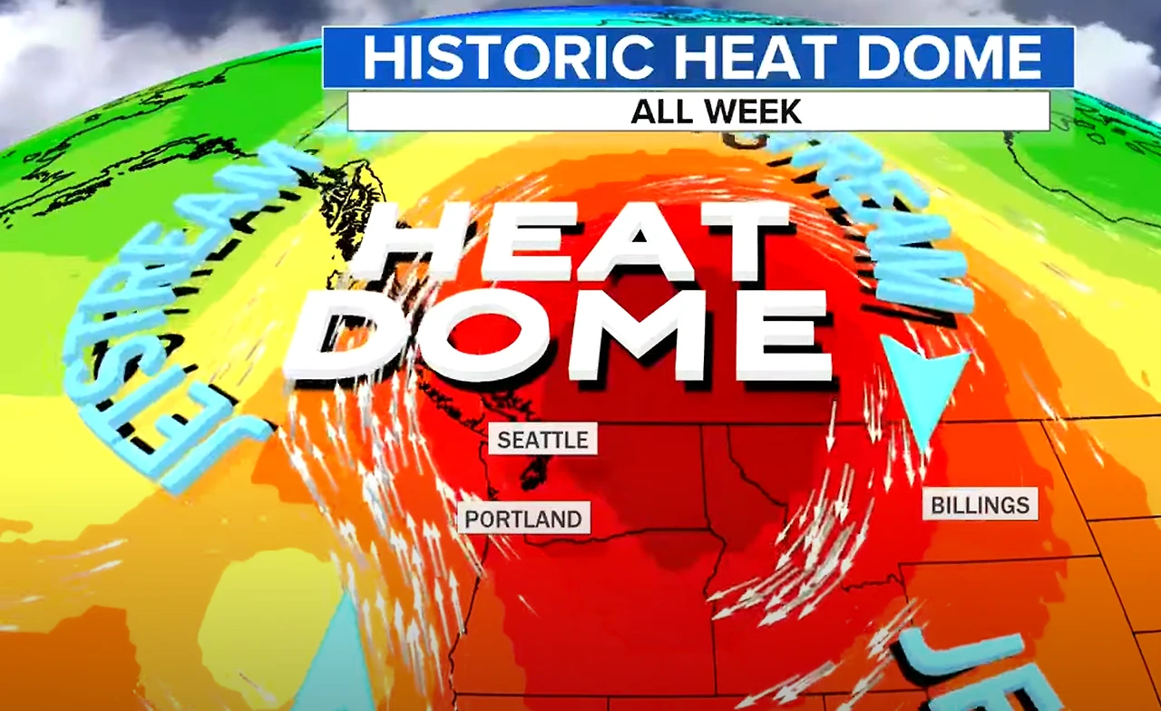 CBS 뉴스에 의하면 미국 북서부의 포틀랜드 온도가 46도, 시애틀이 42도를 기록하면서 열 돔 현상의 한가운데 위치했음을 알렸다. 이는 만년에 한번 올까 하는 기록인데 이도시의 평균 여름 기온은 23도에서 27도 사이다. <Medford>에 따르면 여름 평균 기온이 50년 전 1970년대 보다 현재 4.2도가 올랐다고 한다. 에어컨 시설을 갖춘 도시 가구가 전체의 1/3 정도로, 이번 여름 평소보다 빨리 시작된 폭염에 대처하느라 분주한데 기록 적인 온도를 감당할 여력이 없어 블랙아웃(정전 사태)을 염려하고 있다고 한다.