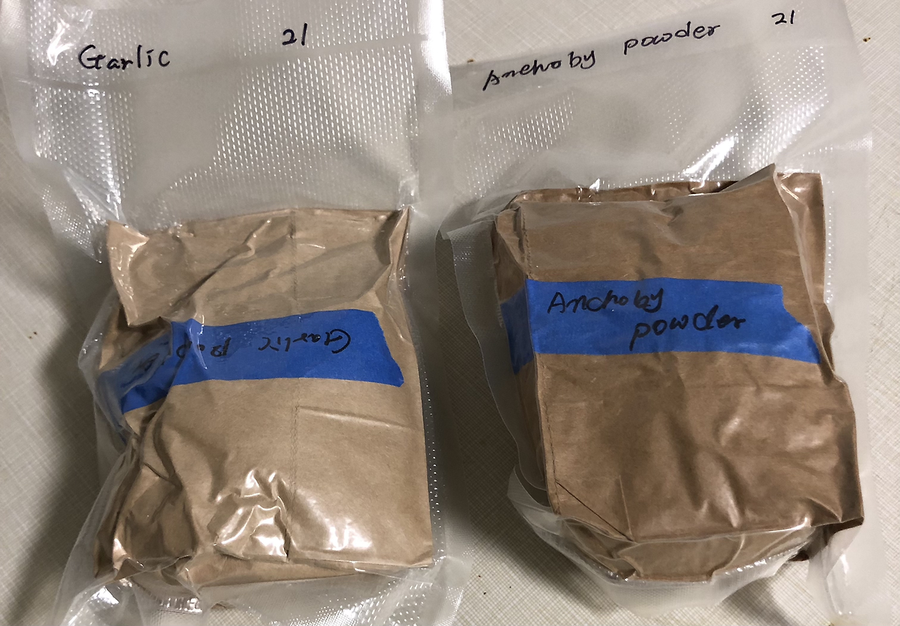 멸치와 다시마, 표고버섯을 갈아서 만든 멸치 다시다를 브라운 백(brown bag)에 넣어 동그랗게 말아서 청 테이프로 내용물의 이름을 적고 vacuum sealer bag에 넣어 진공 포장했다. 간편하고 크게 자리를 차지하지 않아 커다란 컨테이너에 담아 장기 보관하게 되어 너무 좋다. .