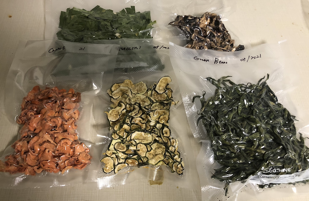 커다란 채반에 꽉 찰 정도의 야채가 말라 부피가 작아져 쿼트(90 그램) 용량의 병에 쏙 들어갈 때는 말할 수 없는 전율을 느꼈다. 도구를 이용하여 병에든 산소를 제거하면 진공으로 밀봉되며 더 신선하게 보관할 수 있다.