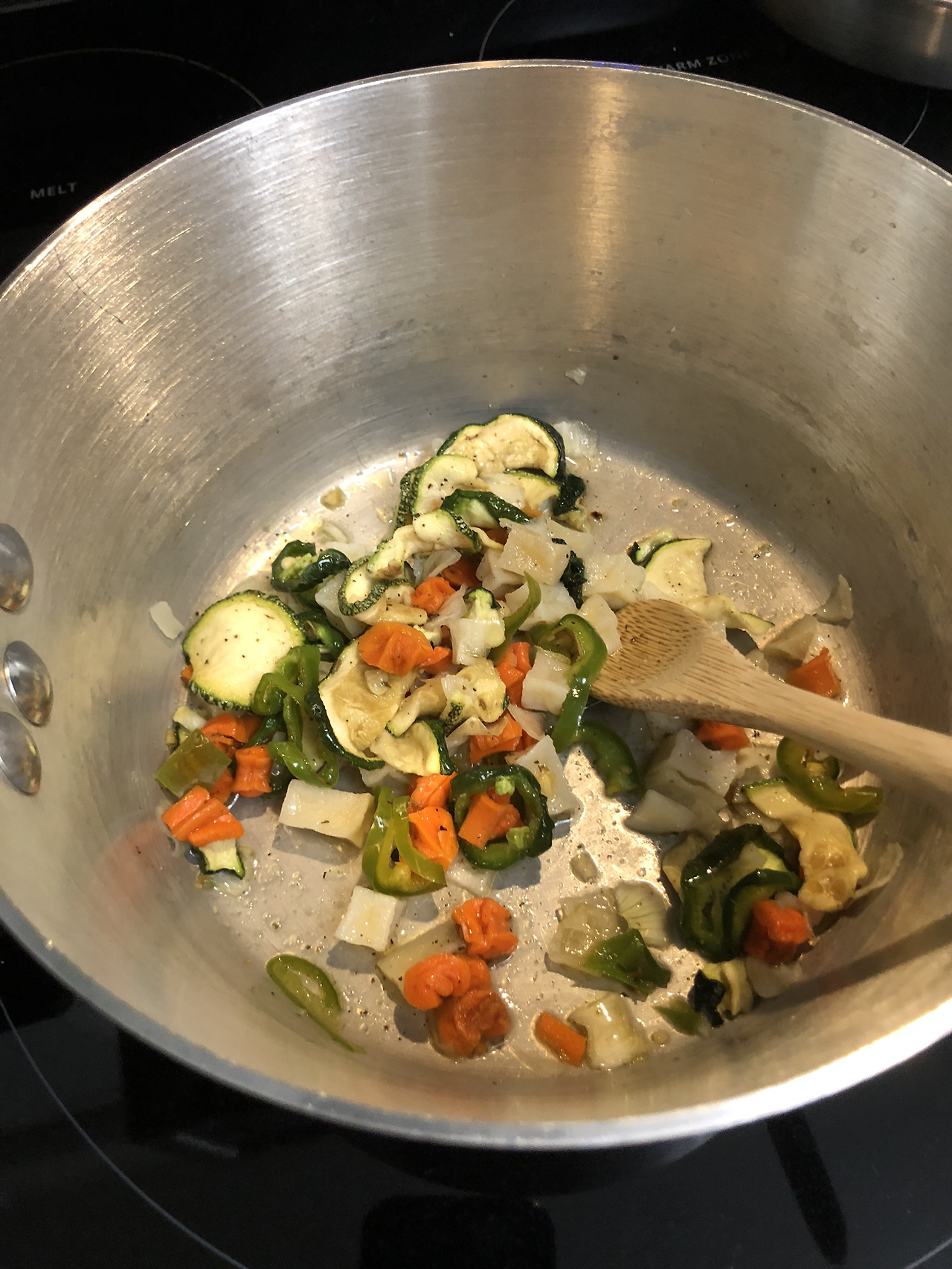 2. 불려진 야채를 꺼내어 소스팬에 올리브기름을 두르고 볶는다.
