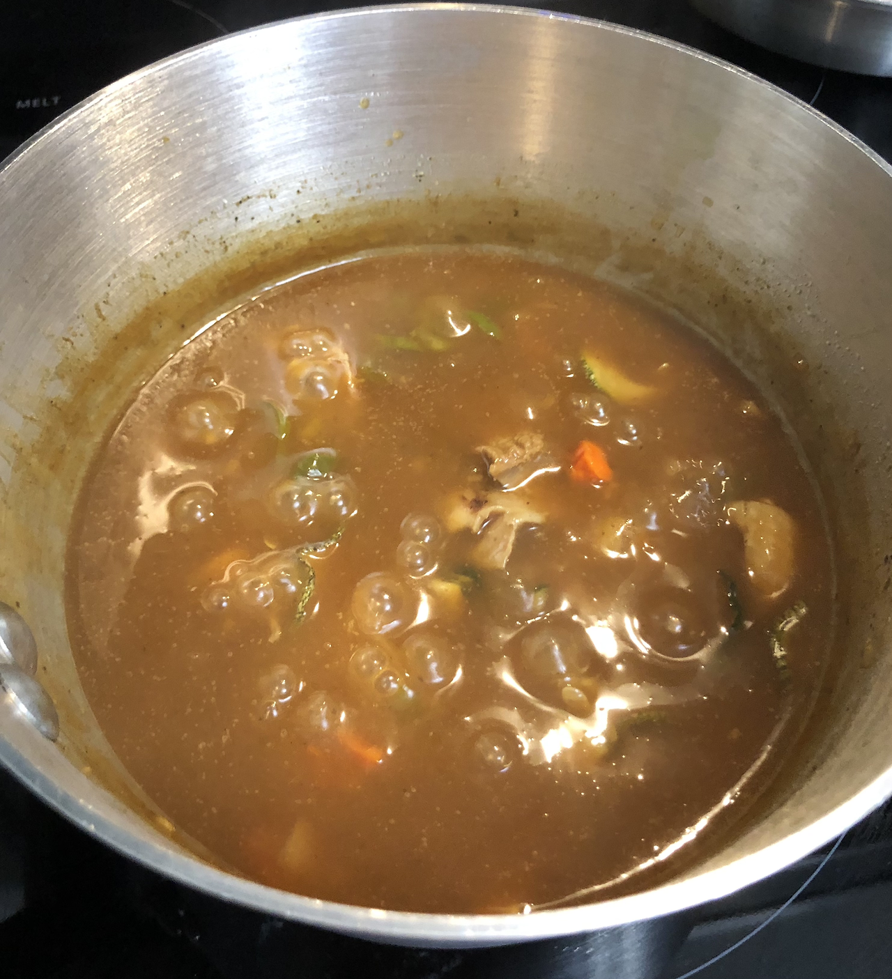 3. 물에 불린 야채가 꼬들꼬들하게 볶아질 때쯤 물을 넣고 카레와 닭고기를 넣는다.