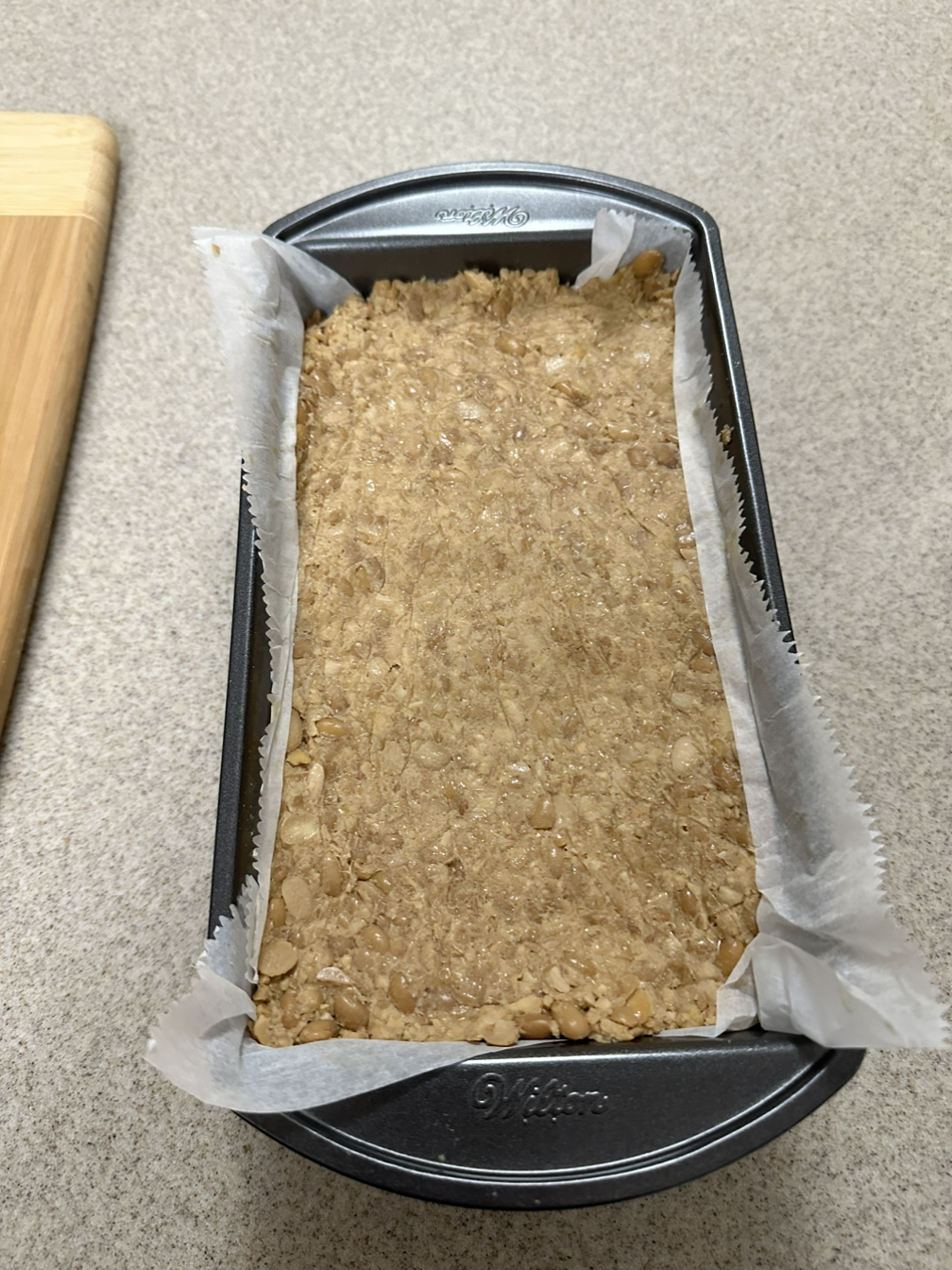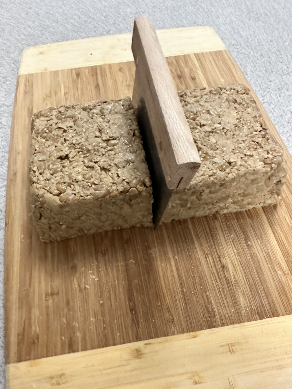 빵 굽는 베이킹 팬에 빻은 콩을 넣고 꾹꾹 눌러 단단한 메주 덩이를 만들고 왁스 페이퍼를 깔아서 메주가 잘 빠져나오도록 했다.
