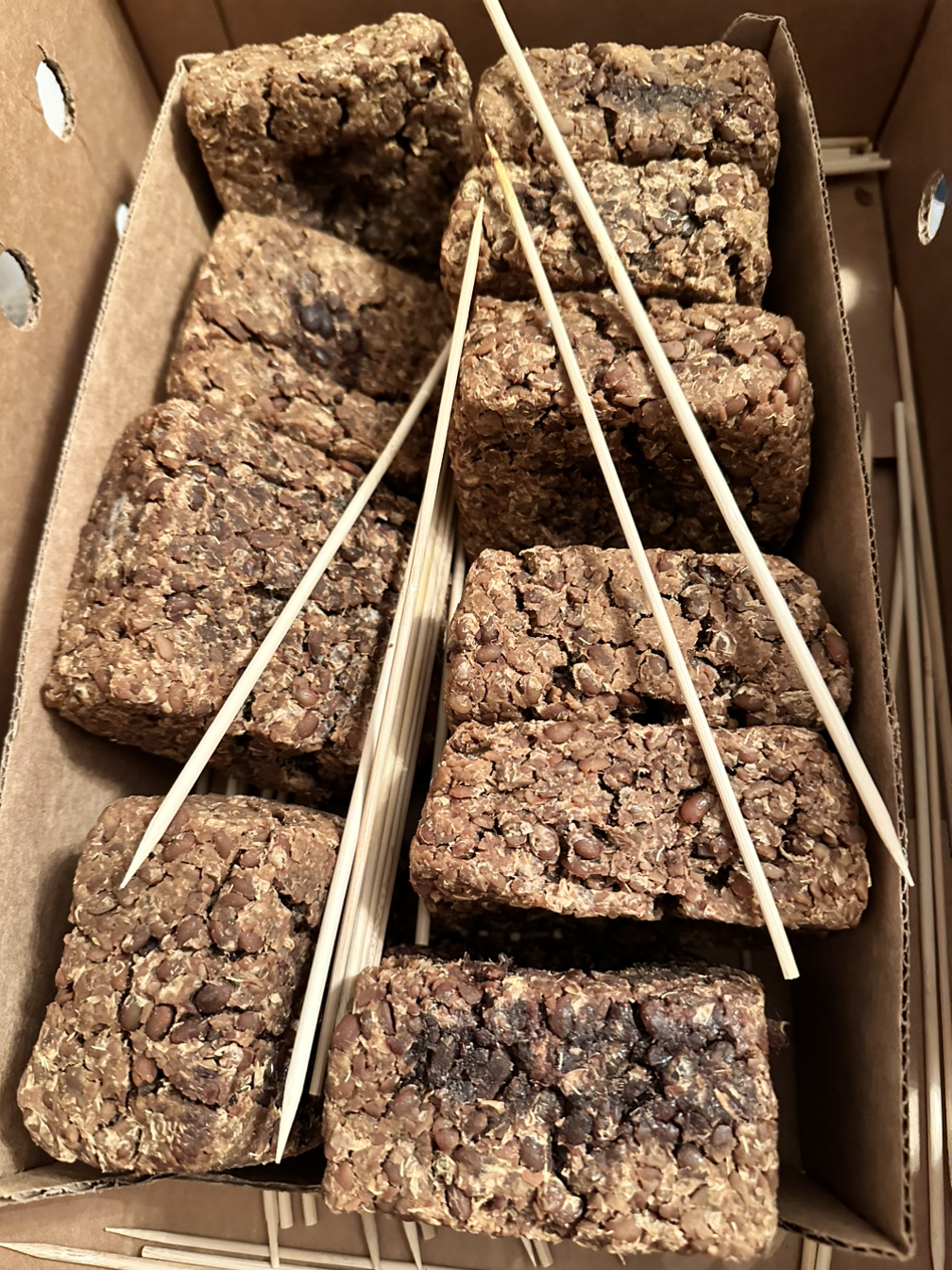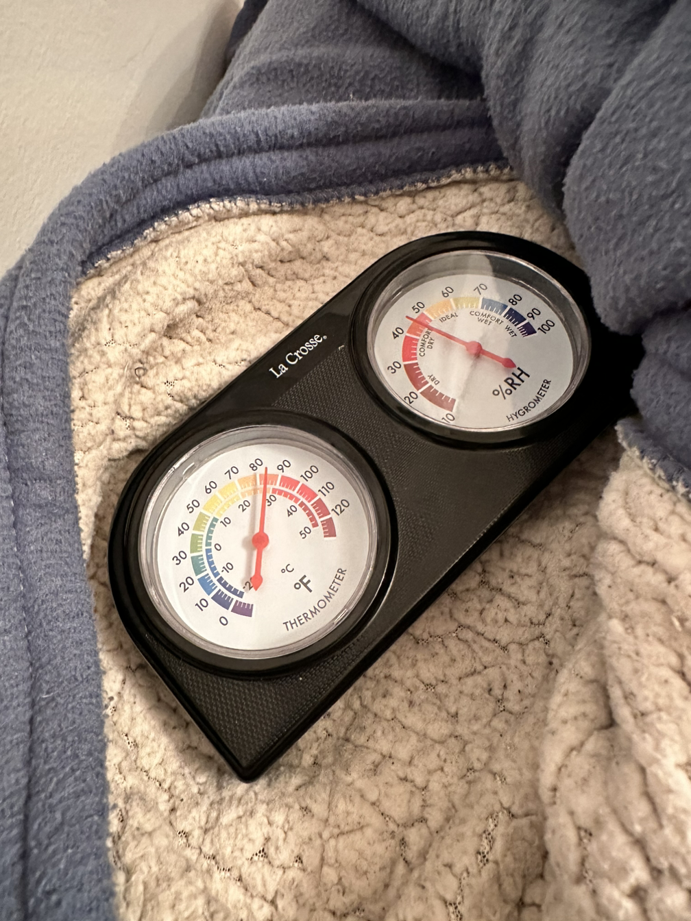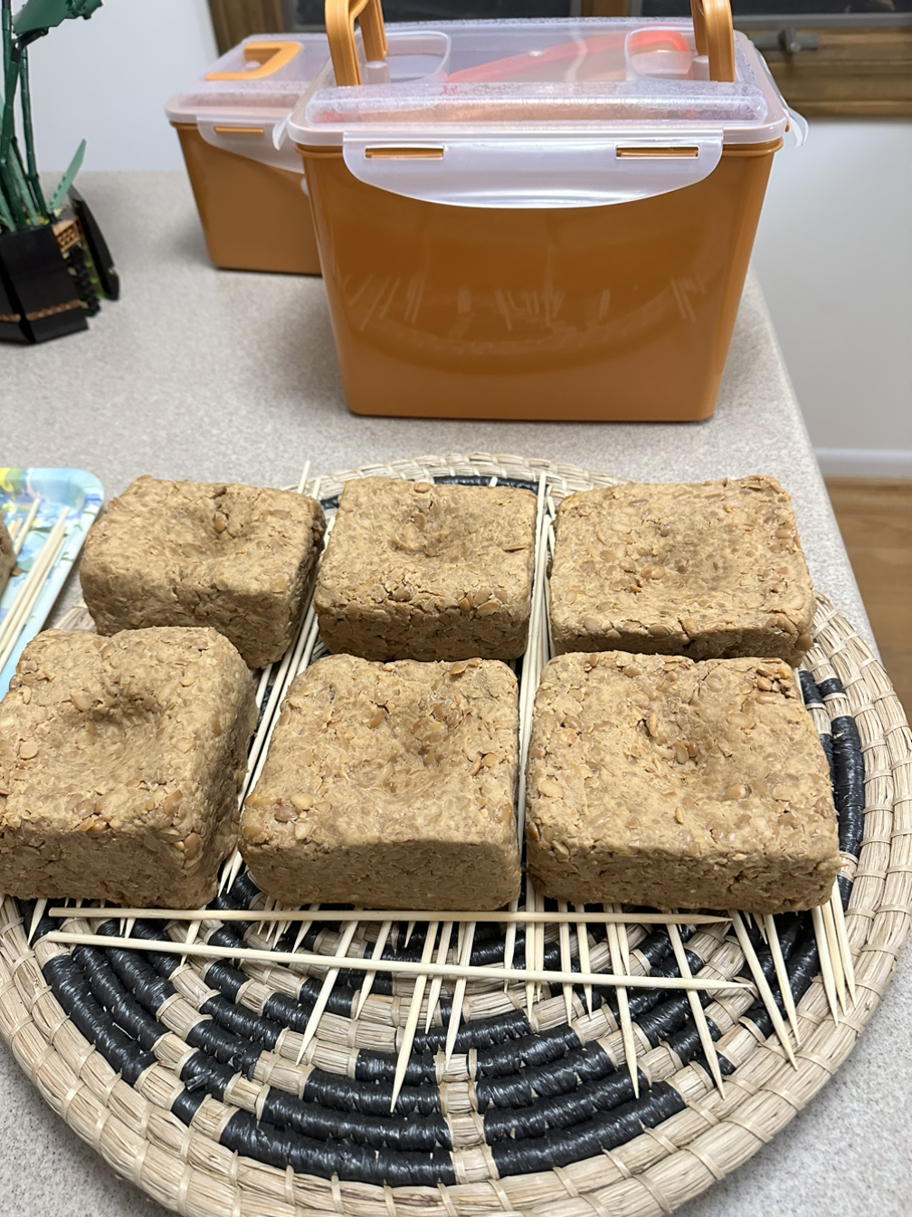 종이 상자에 약 3일 정도 말린( 건조기 포함) 메주를 넣고 바닥에 대나무 고치를 넣어 바람이 통하도록 했다. 바닥에 수건을 깔고 상자를 울 담요로 덮은 다음 전기담요로 그 위를 감싼 안았다. 온도는 28도 습도는 60%로 하려니 온도의 세기를 전기담요 3단으로 했다.(최대 10단) 3일 정도 발효 후 쿰쿰한 냄새가 나길래 열어보니 벌써 많이 발효가 되어있고 습도가 높아져 있어(80%) 꺼내어 건조기에 말렸다. 다시 상자에 넣고 4일을 띄우니 총일주일이 걸렸다. 이제는 꺼내어 소쿠리에 삼베 보자기를 펴고 메주를 담아 실외에서 한 달 정도 딱딱하게 건조되기를 기다리는 중이다. 미시간은 밤에는 영하로 떨어지기 때문에 얼지 않도록 안으로 들여온다.