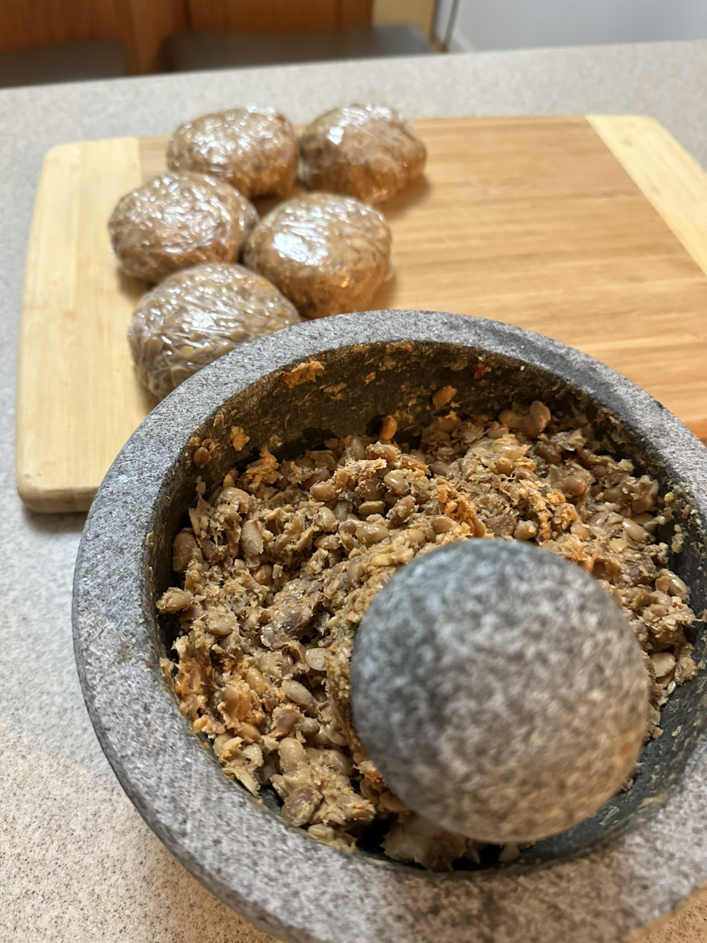 푹 익혀진 콩을 비닐에 싸서 발로 밟거나 방망이로 찧던데 내경우는 블랜더에 갈고 나머지는 손절구를 이용해서 빻았다. 블랜더를 이용하지 않으면 한 나절이 걸려도 빻을 수가 없을 것 같았다. 쉽게 빻기 위해 너무 푹 삶는 것보다 약간 덜 삶아져도 블랜더로 가는 것이 영양 손실 면에서 더 나은 방법이라고 생각했다.